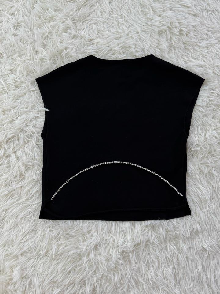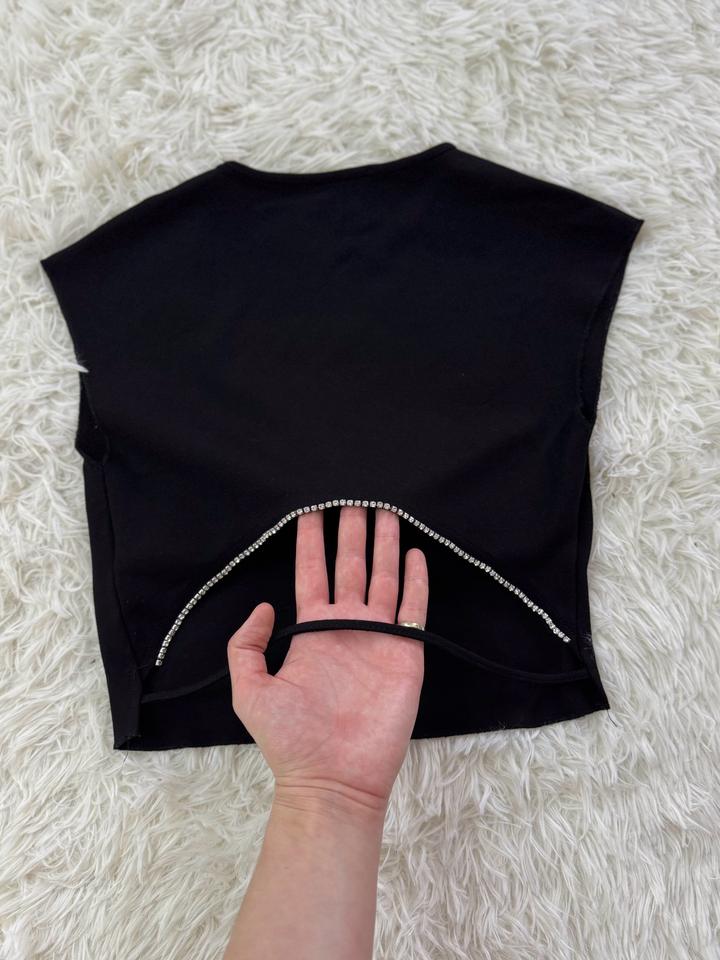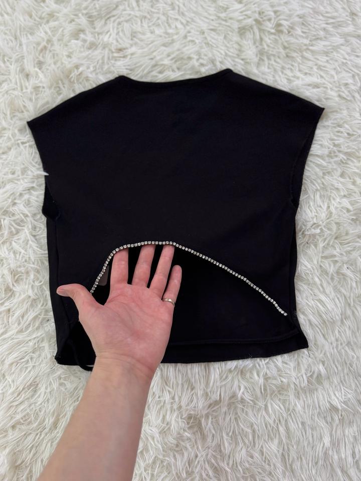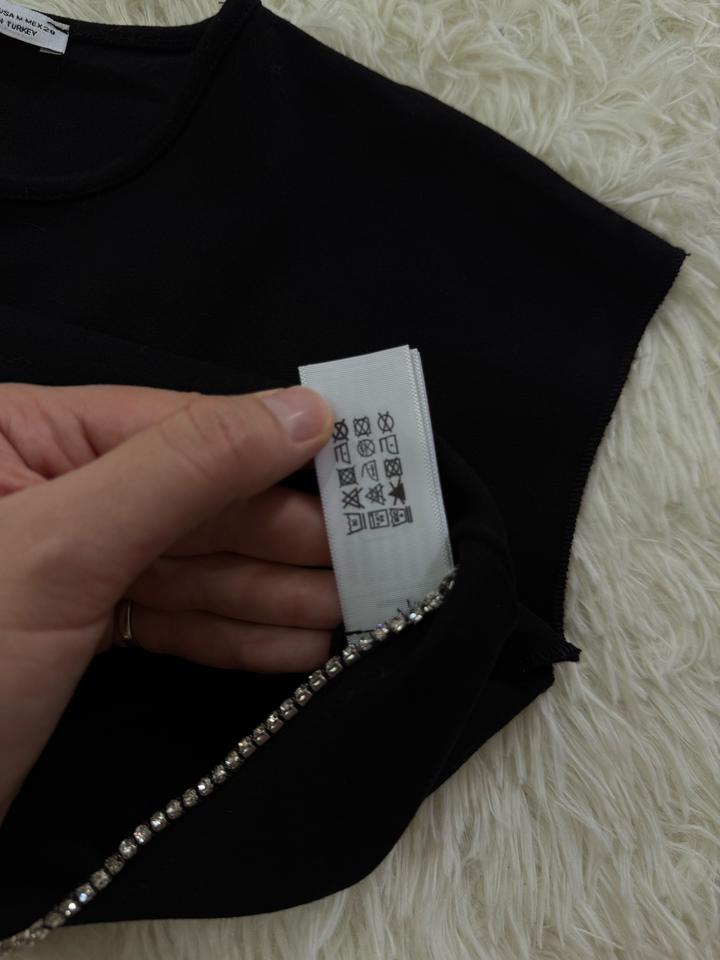 Топ черный укороченый сзади внизу приоткрыто есть декоративвные стразы. При стирки сел немного подойдет на размер xs, s Артикул: 539680