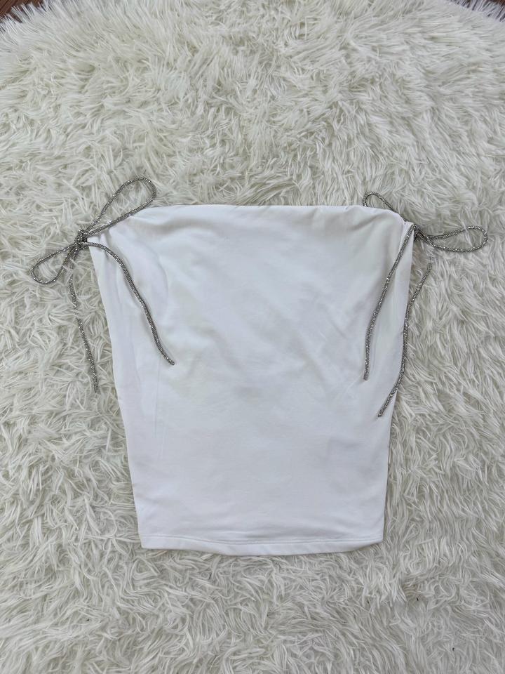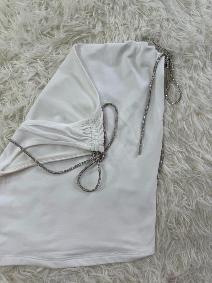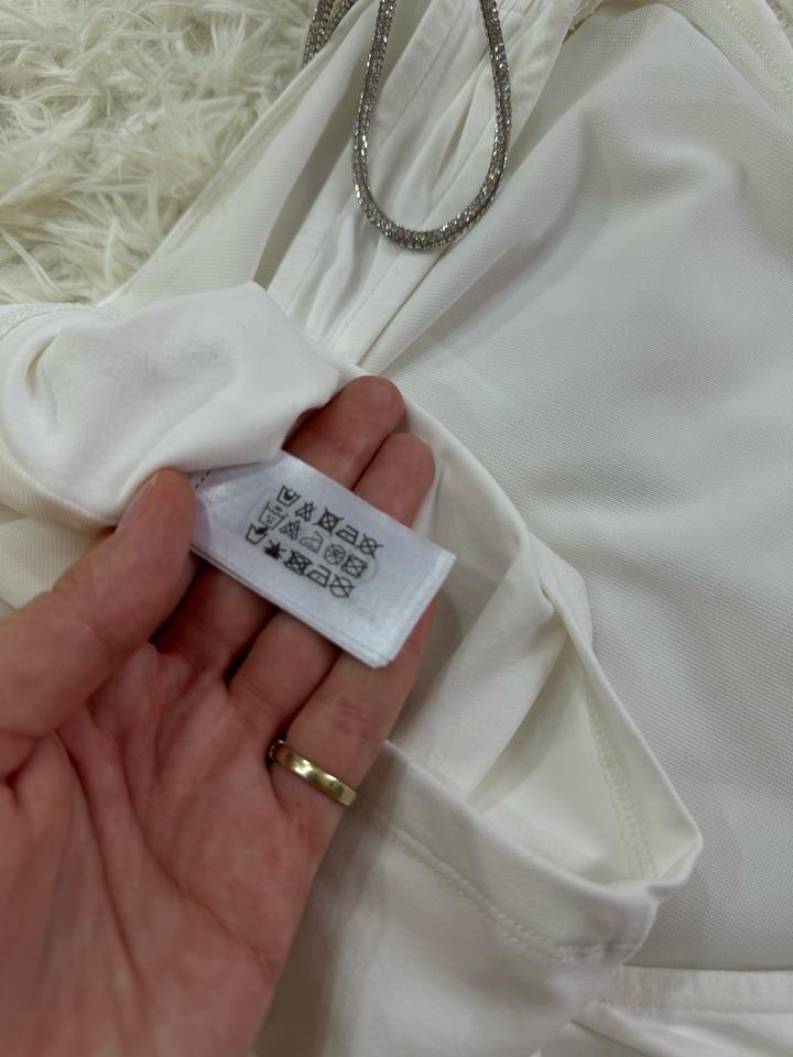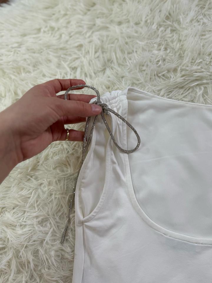 Топ белый, имеются завязки переливающие можно завязать в бантик или просто оставить весящими. Размер 42-44 Артикул: 539712