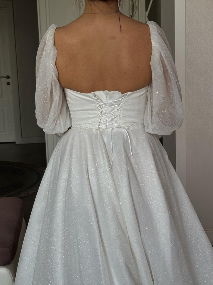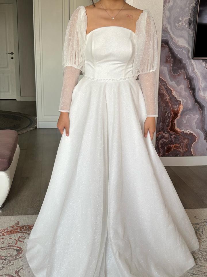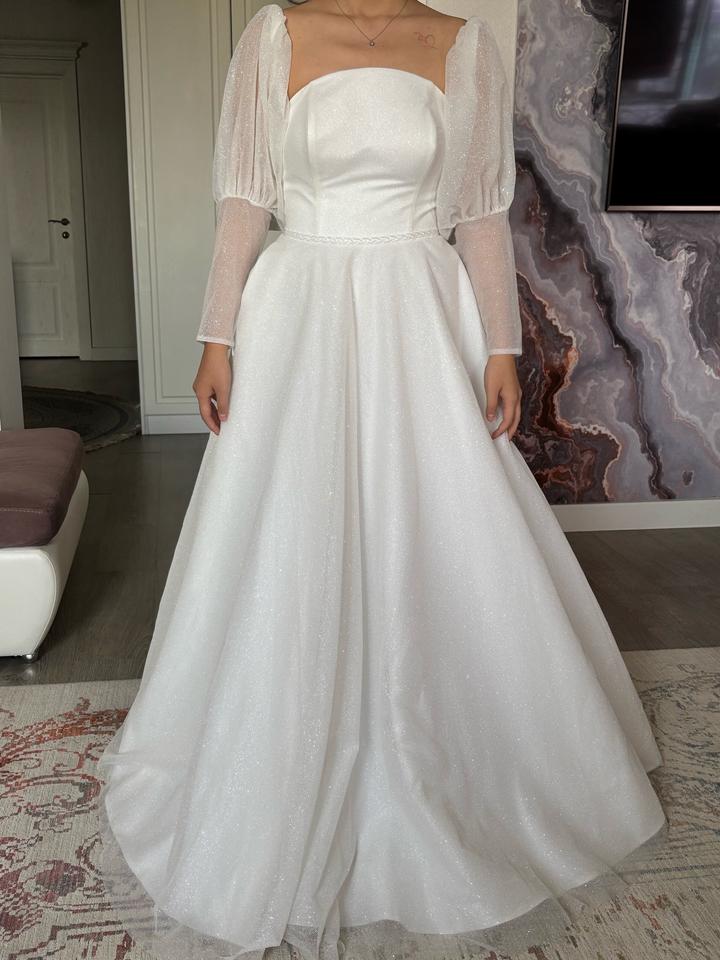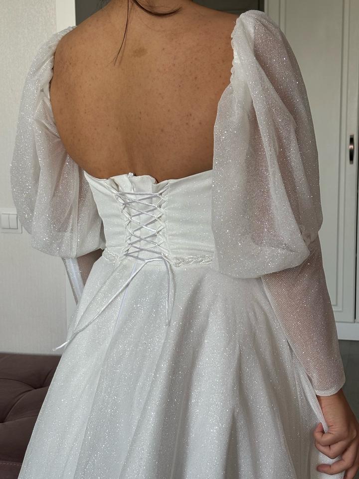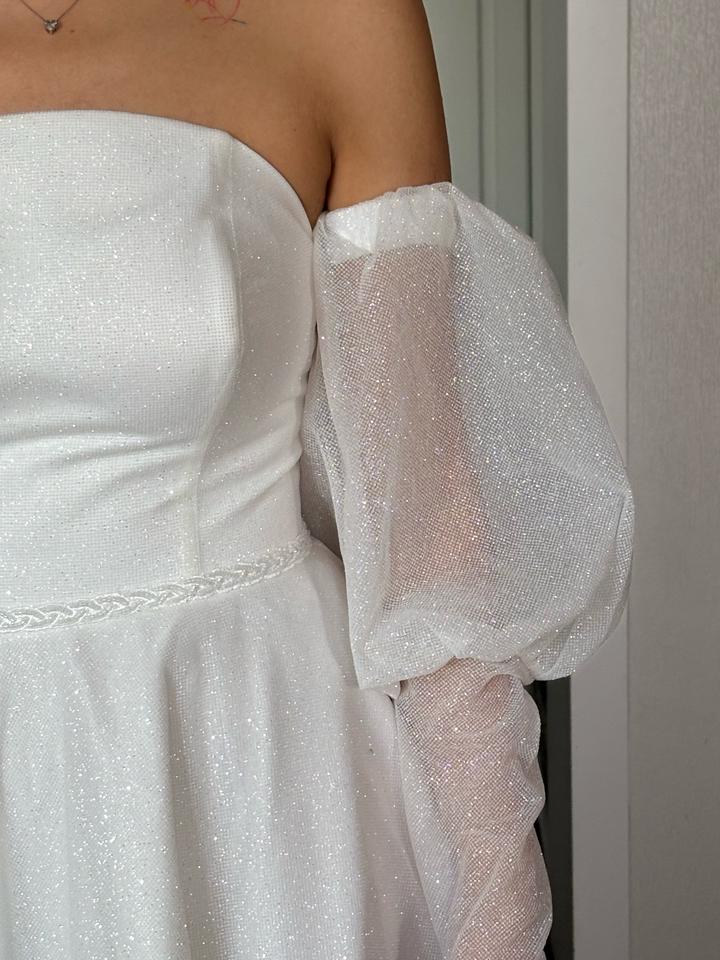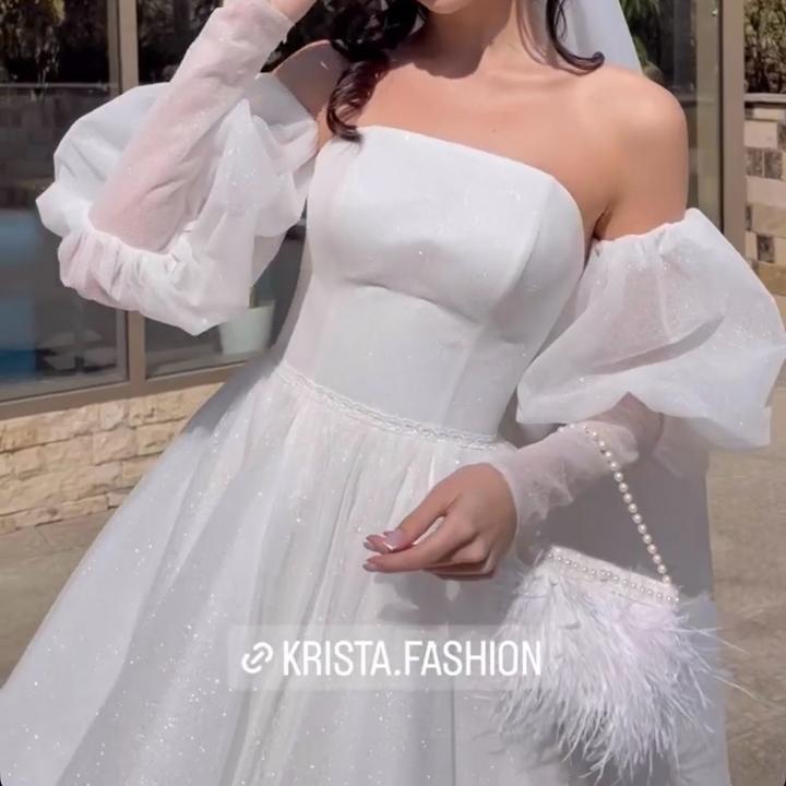 Свадебное платье, цвета Айвори, 48 размера. Изначально купила его, потом решила взять другое. Новое, с бирками. Имеются рукава фонарики, можно их снять. Платье блестящее, красиво переливается. Имеется дефект на правом рукаве. Артикул: 539933