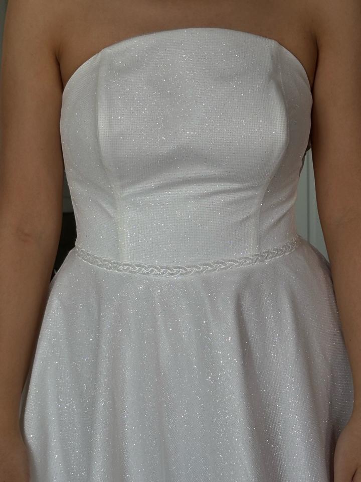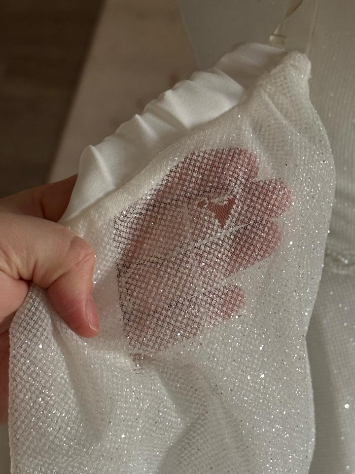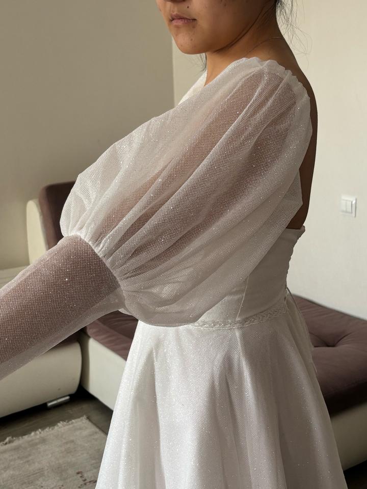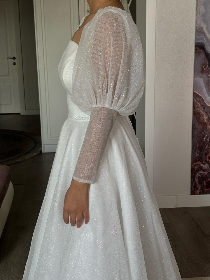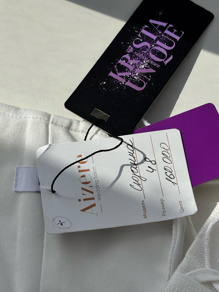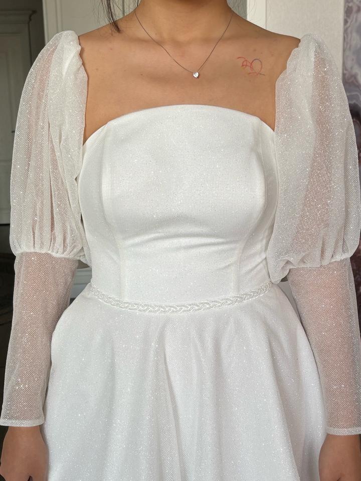 Свадебное платье, цвета Айвори, 48 размера. Изначально купила его, потом решила взять другое. Новое, с бирками. Имеются рукава фонарики, можно их снять. Платье блестящее, красиво переливается. Имеется дефект на правом рукаве. Артикул: 539933