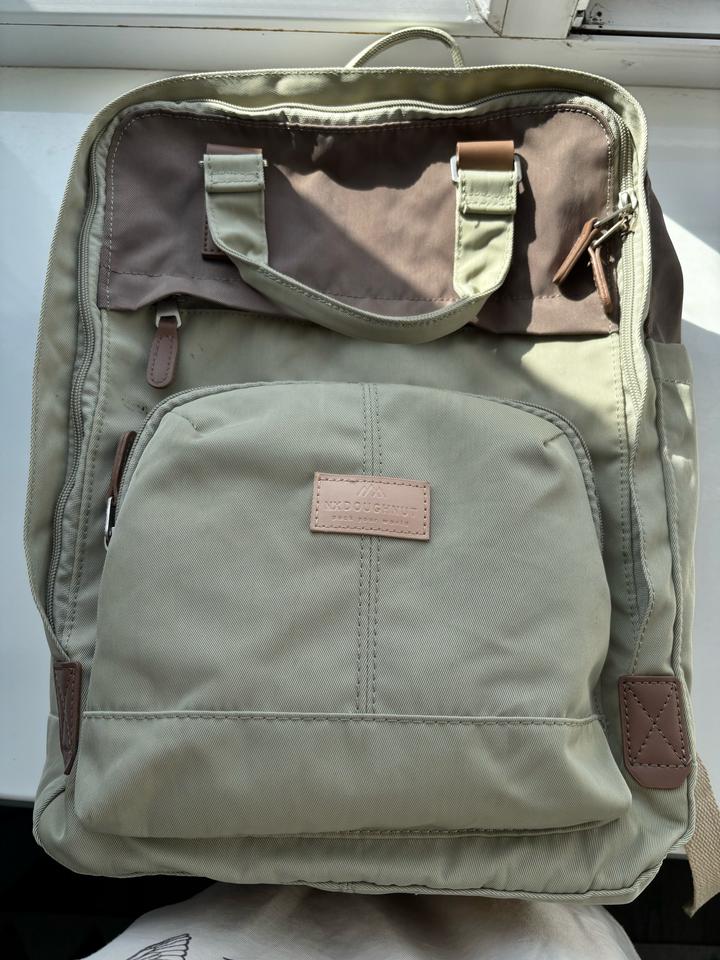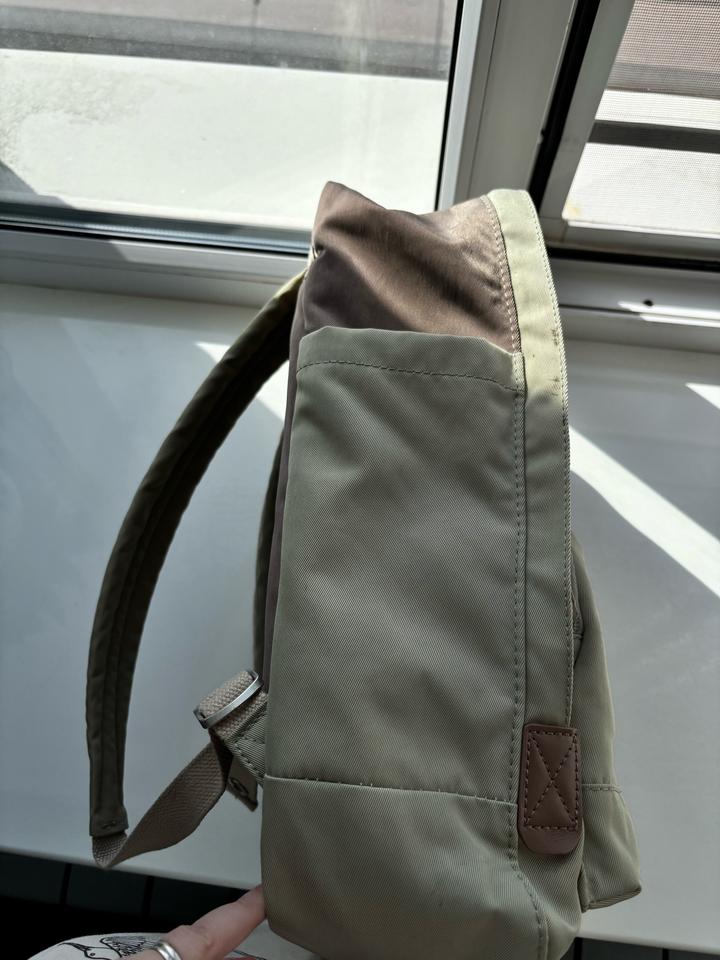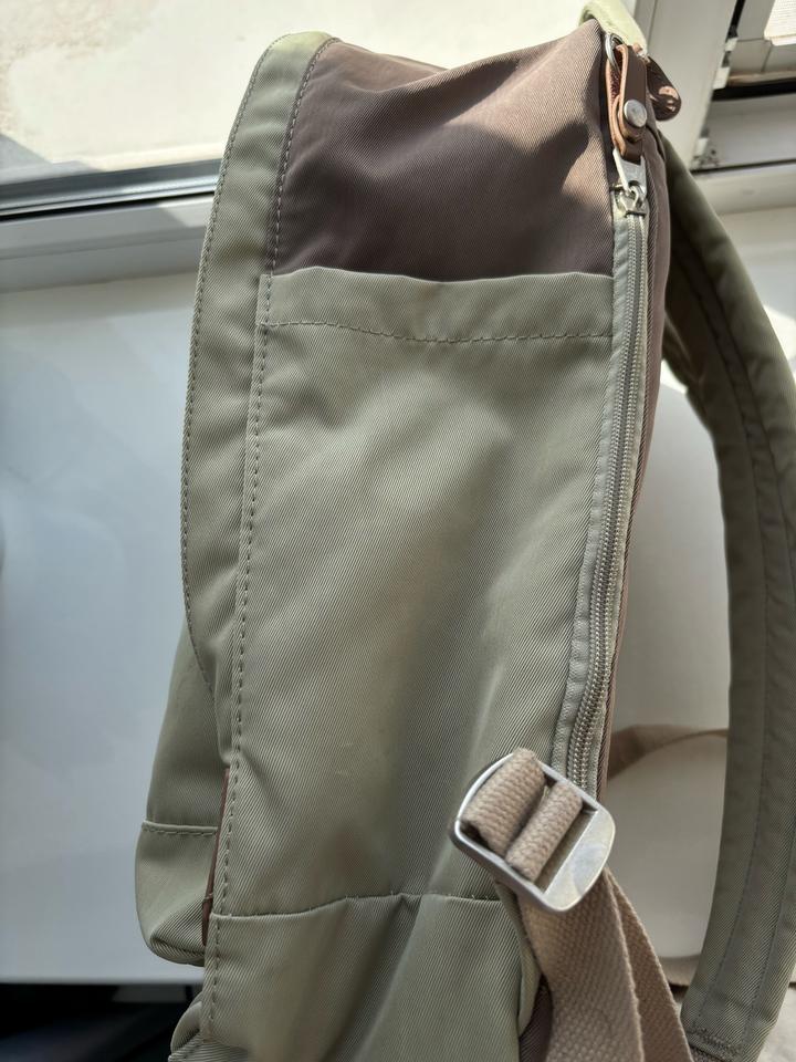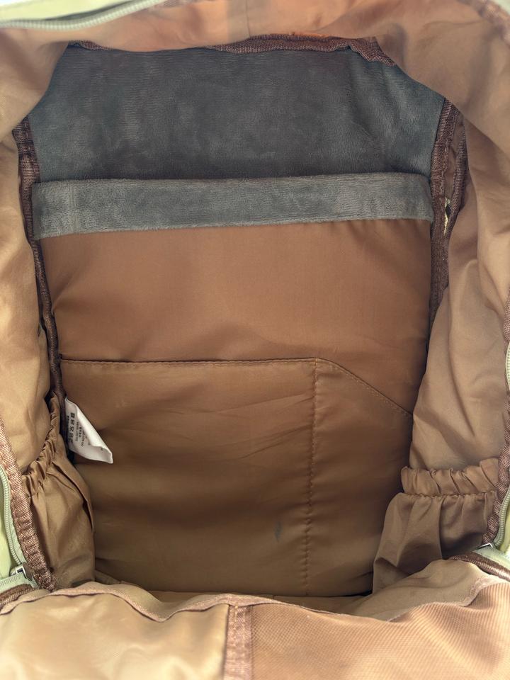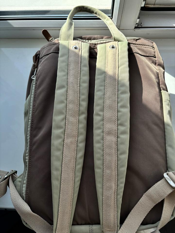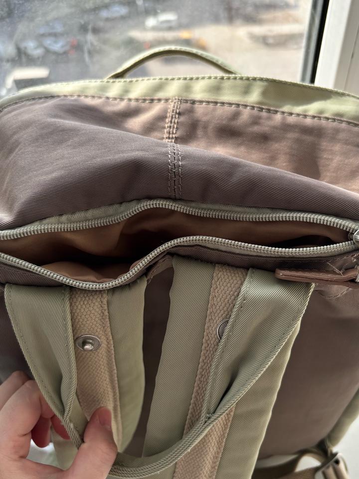 Рюкзак зелено-коричневого цвета, имеет множество карманов. Есть пятно и дефект на лямке. Крепление на кнопке отсутствует. Артикул: 539983
