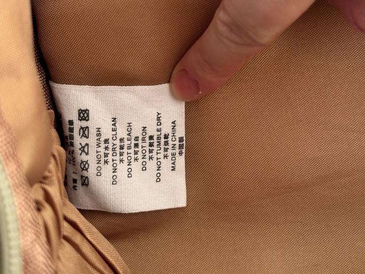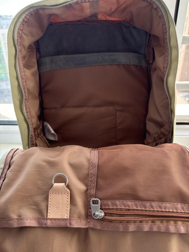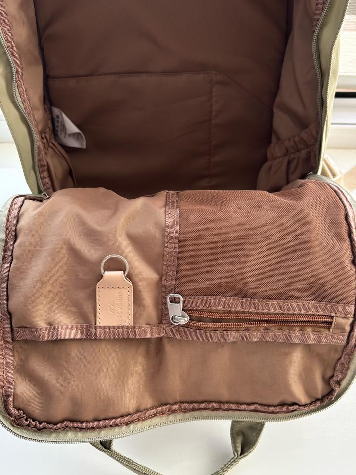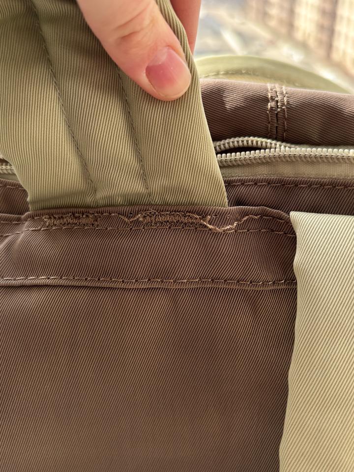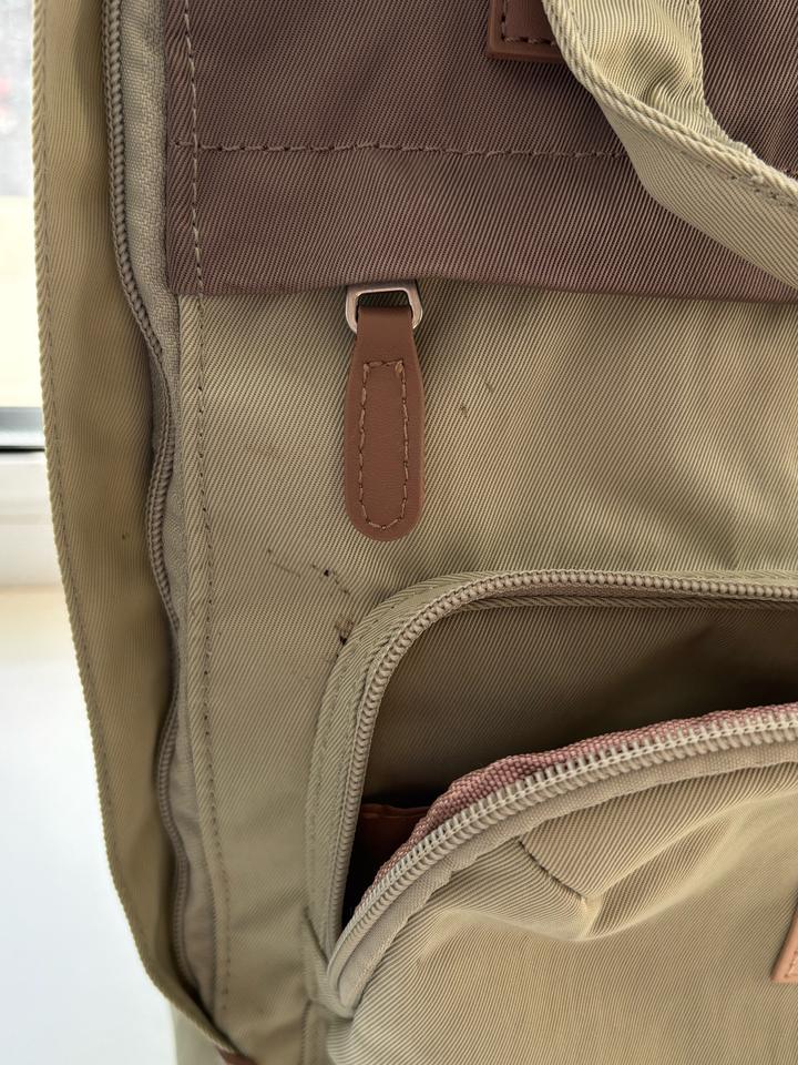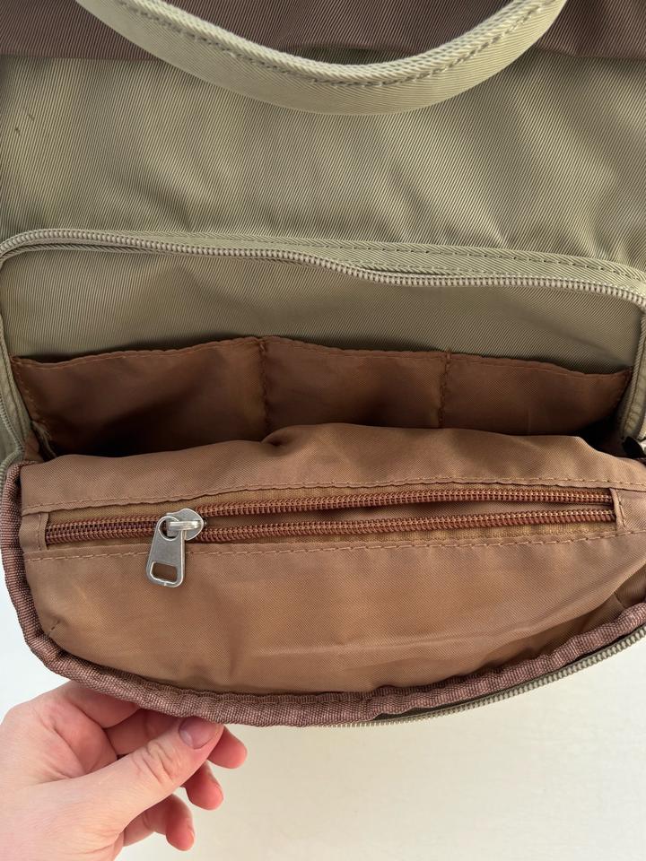 Рюкзак зелено-коричневого цвета, имеет множество карманов. Есть пятно и дефект на лямке. Крепление на кнопке отсутствует. Артикул: 539983