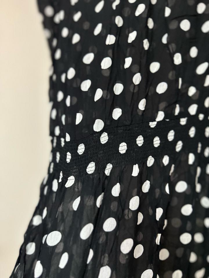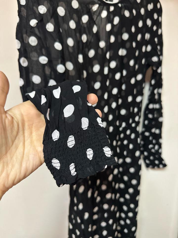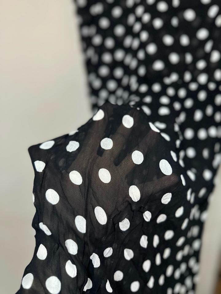 Лёгкое и воздушное, с деликатной прозрачностью и игривым принтом в горох. Мягко струится по фигуре, подчёркивая талию и создавая женственный силуэт. Идеально для романтичных образов — от дня до вечера. Артикул: 540013