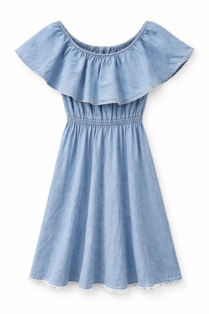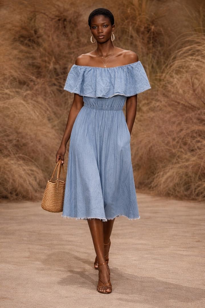 Новое легкое голубое платье из денима с открытыми плечами и мягкой драпировкой. Приталенный силуэт с эластичной талией и воздушной юбкой. Артикул: 540159