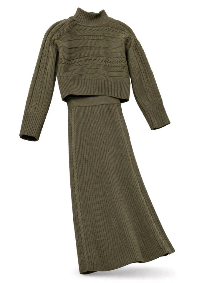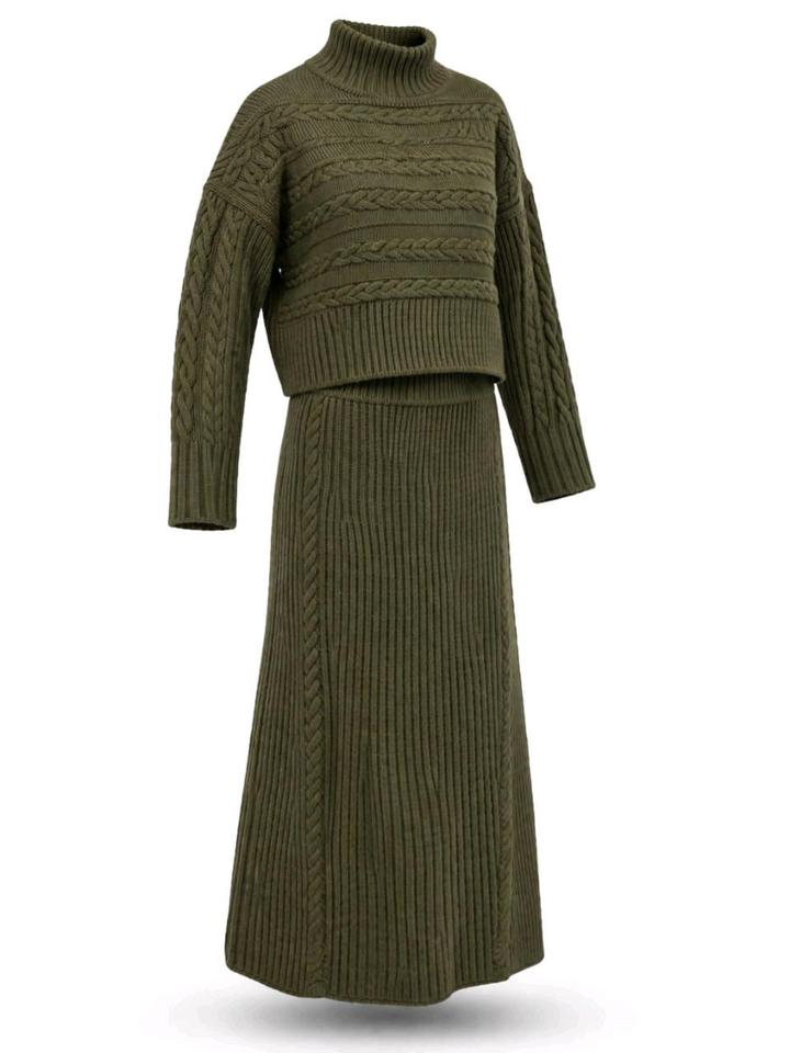 Вязаный костюм-двойка (джемпер + юбка макси) в цвете хакиS/M