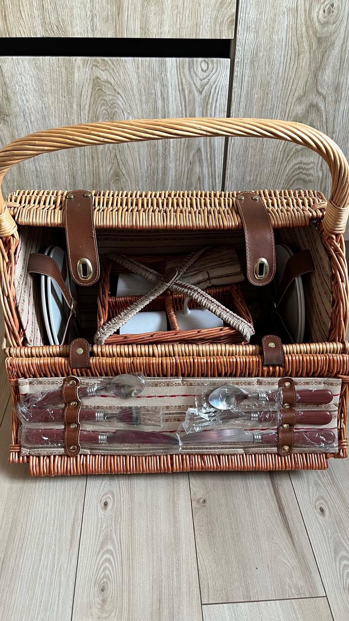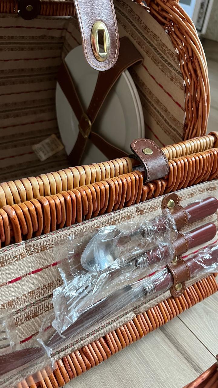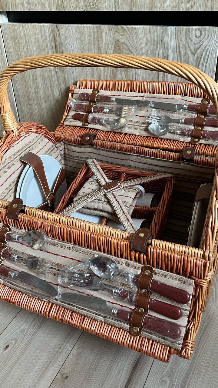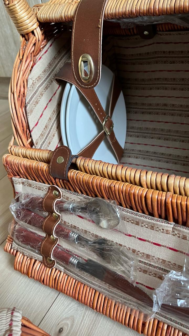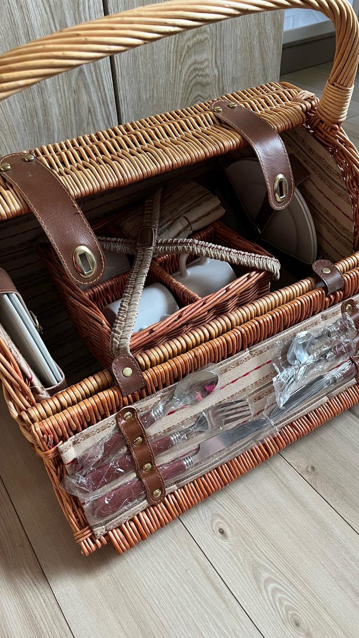 Продаю корзинку для пикника, полностью новая, настоящее плетение, комплект на 4 человек. Набор чашек, тарелок, ножи, вилки. Все на ремнях для удобства транспортировки. Есть свободное место под иное. Удобный размер, плетение качественное. Абсолютно новая. Идеально для подарка. Артикул: 540557