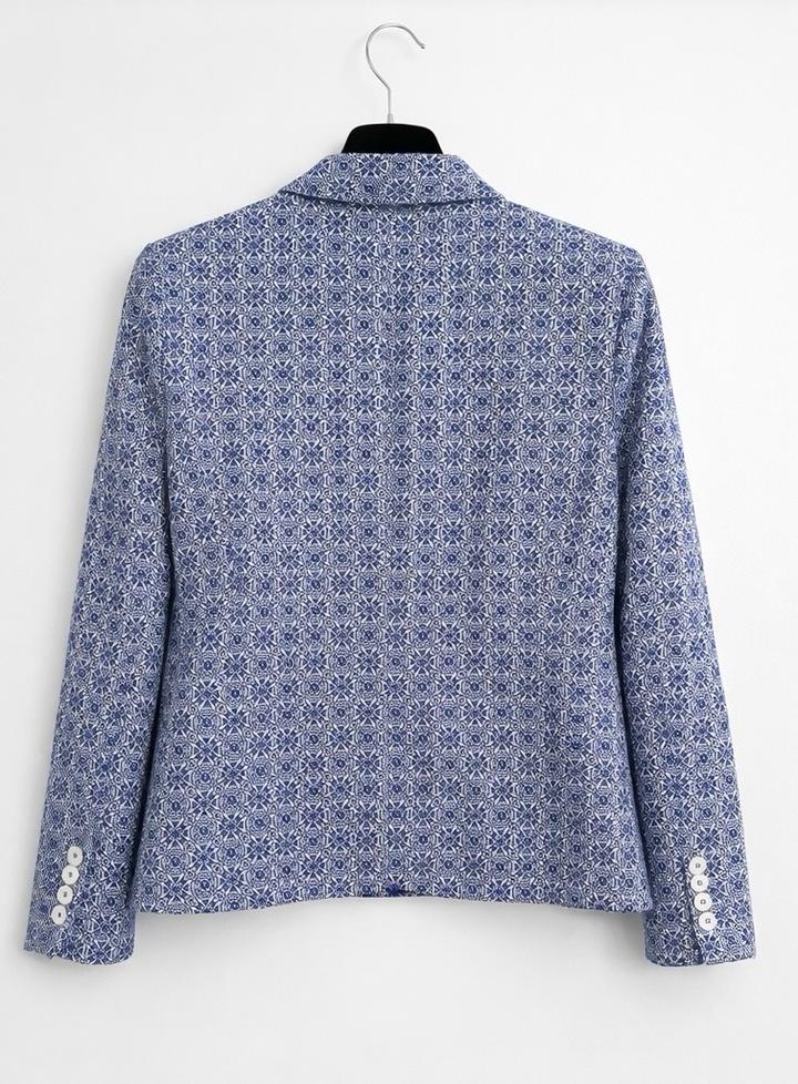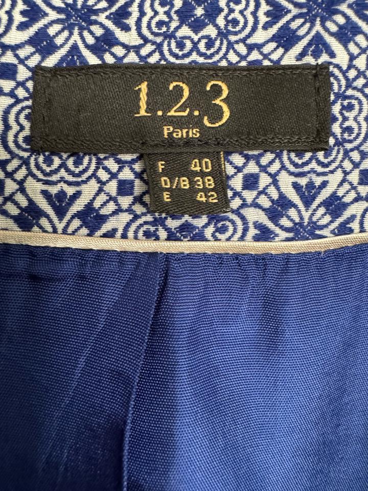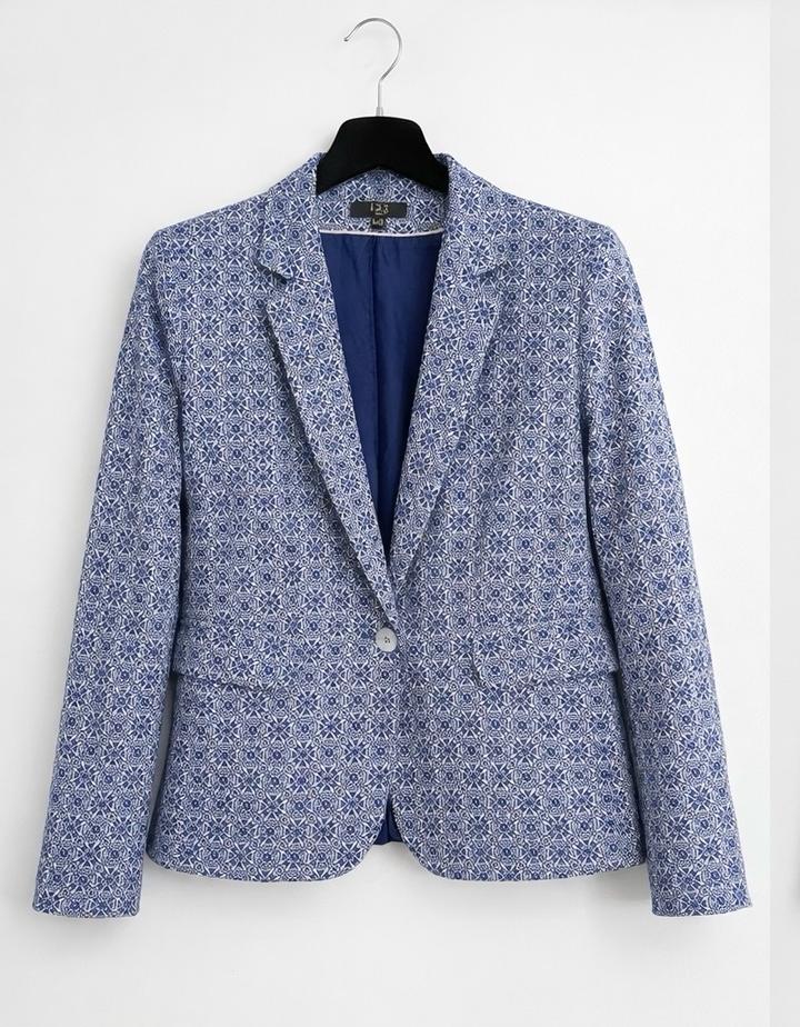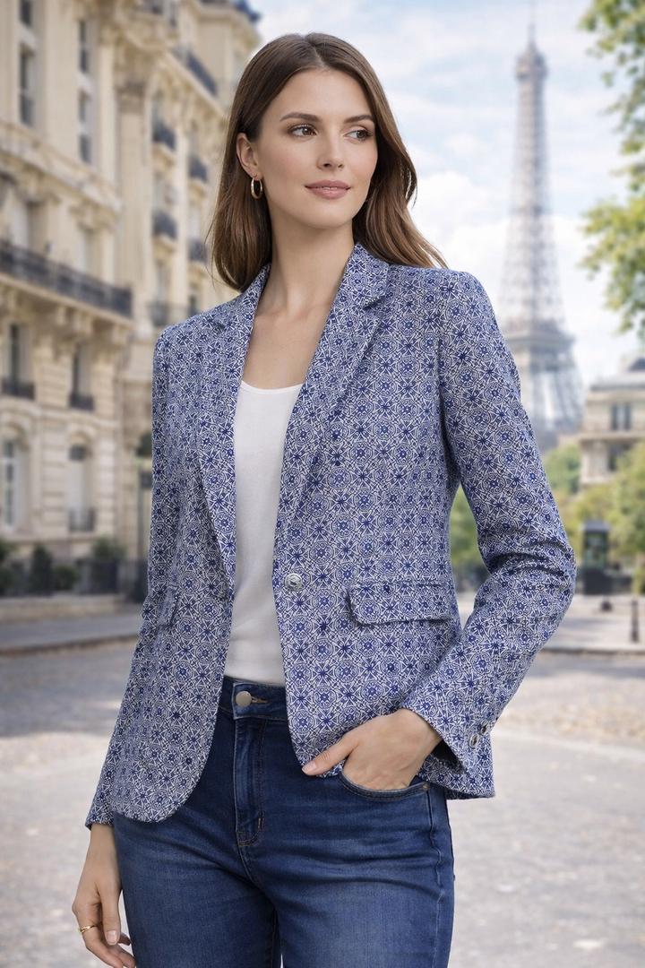 Элегантный жакет французского бренда 1.2.3 Paris - аккуратный приталенный крой - красивый сине-белый принт - легкий, комфортный - качественная подкладка - Смотрится очень дорого и стильно - Идеален для офиса и повседневных образов Можно носить: — с джинсами (как на фото — трендовый casual) — с классическими брюками (деловой стиль) — с платьем (женственно) *Французский стиль — всегда актуален* Артикул: 540717