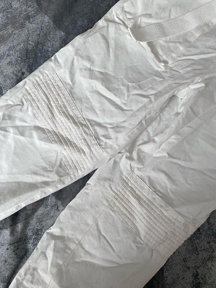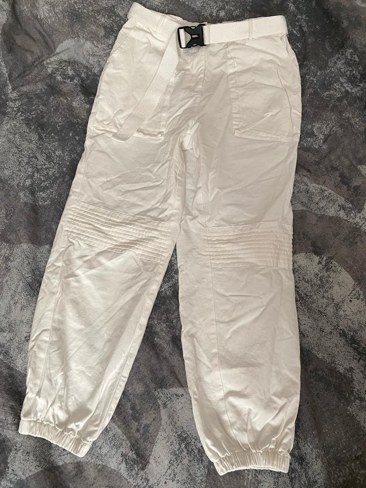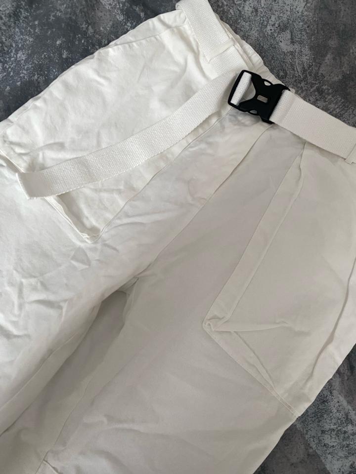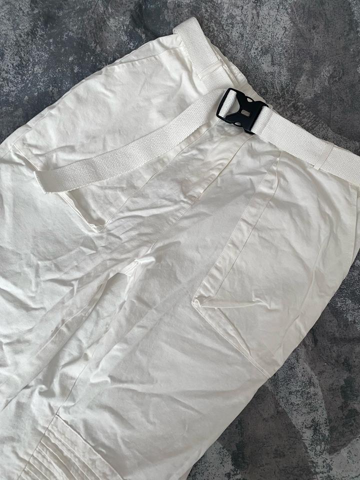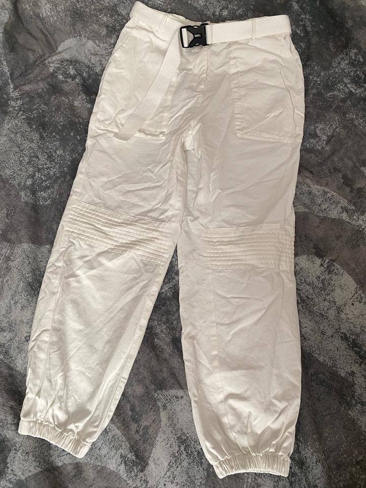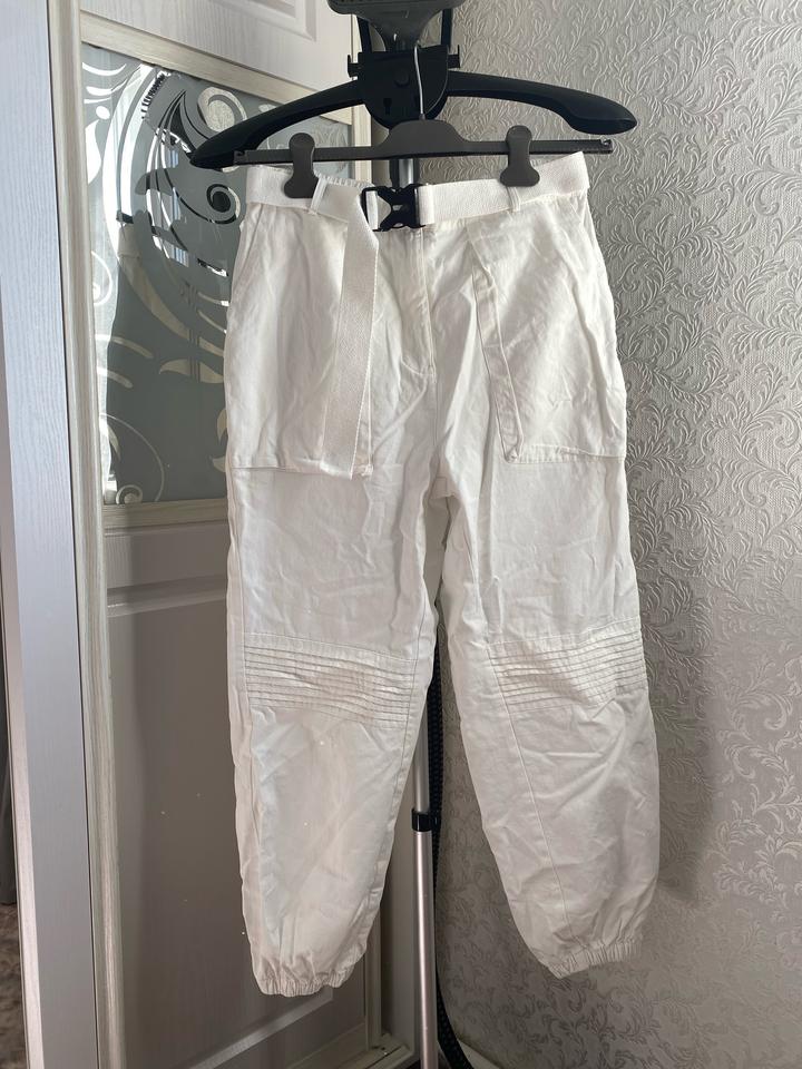 Белые карго-брюки / джоггеры Стильные и удобные брюки в актуальном стиле карго. Лёгкие, комфортные, отлично подойдут на каждый день, прогулки и поездки. Есть пояс, можно регулировать посадку. Внизу на резинке — красиво смотрятся с кроссовками. Чуть-чуть просвечивают. Состояние: отличное Артикул: 541556