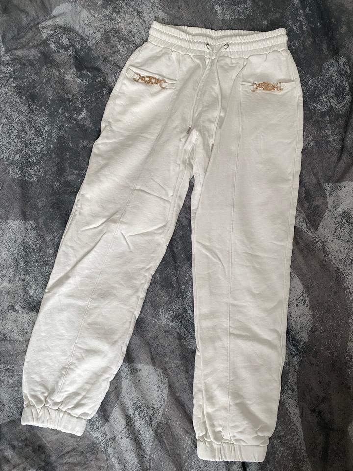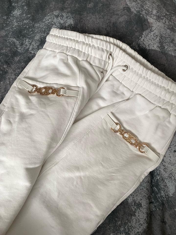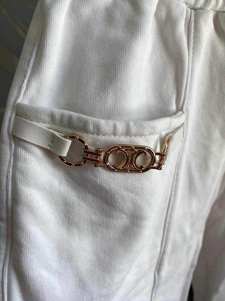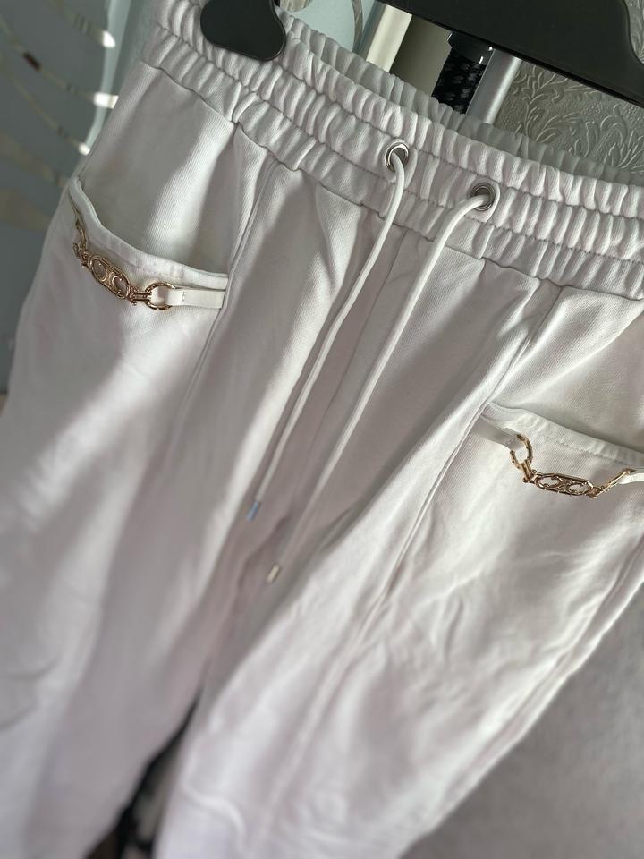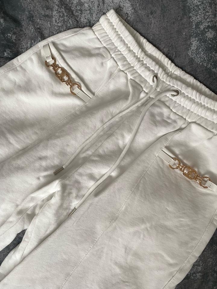 Стильные и удобные брюки в светлом оттенке. Отлично подойдут на каждый день, прогулки и поездки. Мягкие, комфортные, на резинке и с завязками — хорошо садятся по фигуре. Внизу также на резинке, красиво смотрятся с кроссовками. Интересный акцент — декоративные элементы спереди ✨ Подойдут на размер M-L(44-46). Состояние: отличное Артикул: 541579