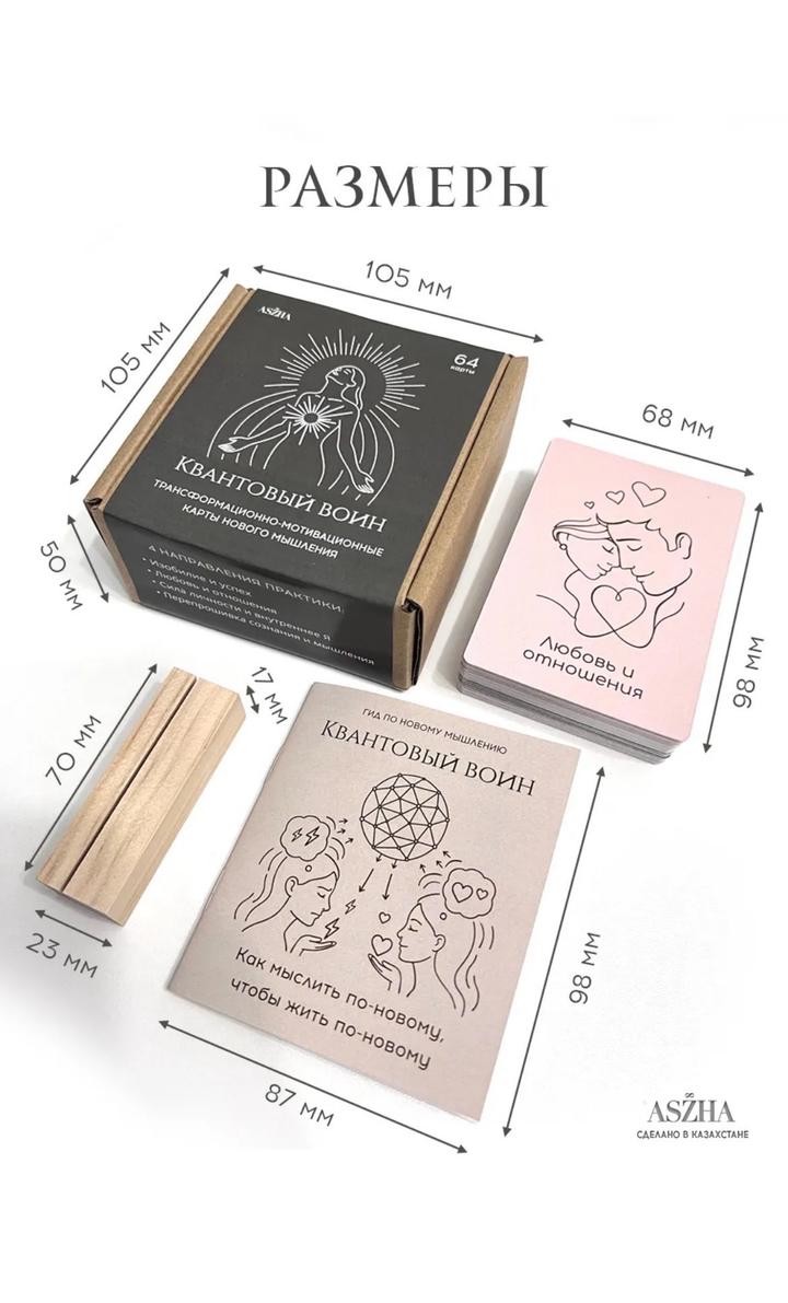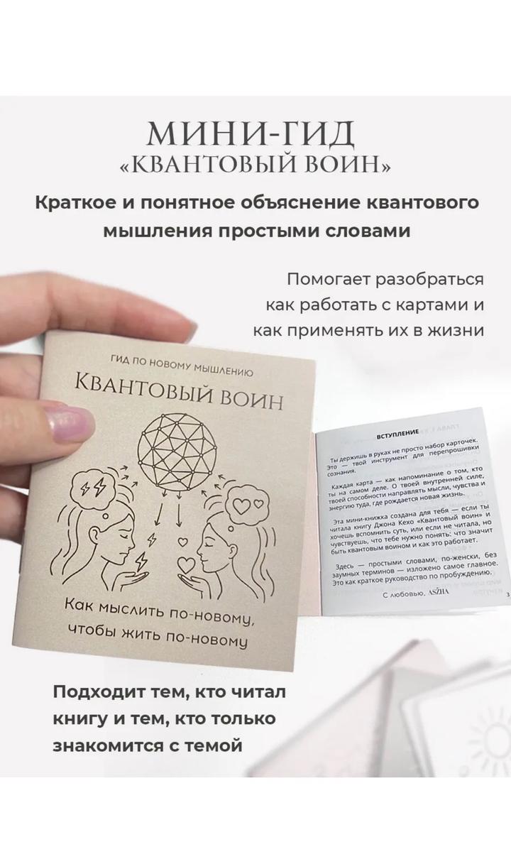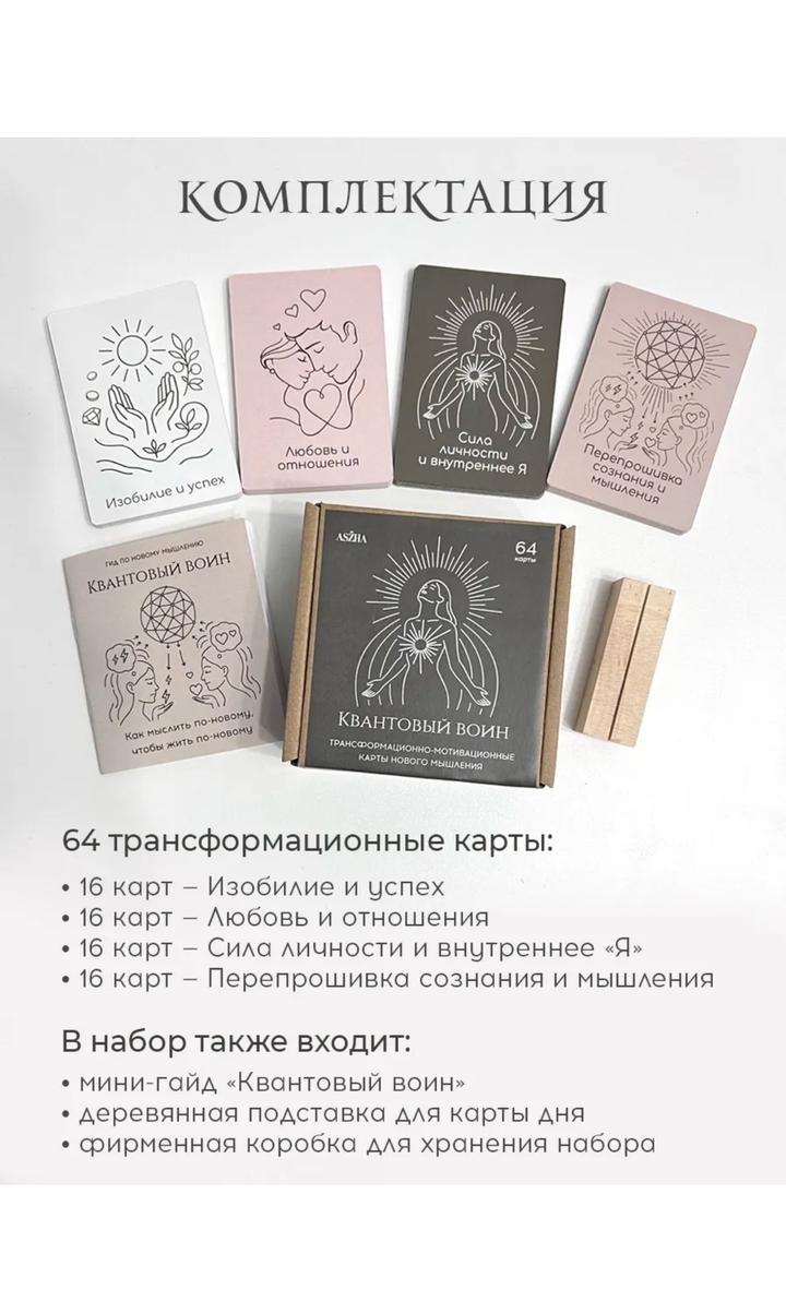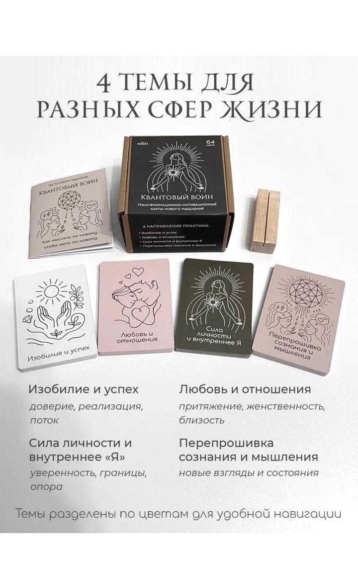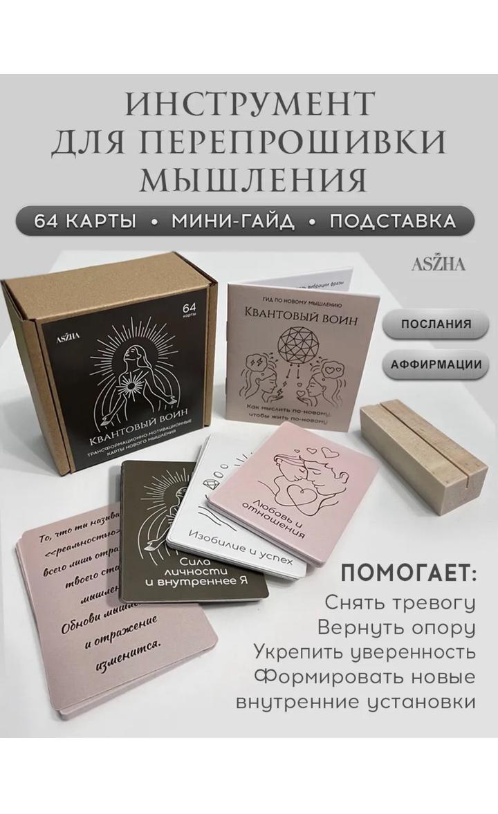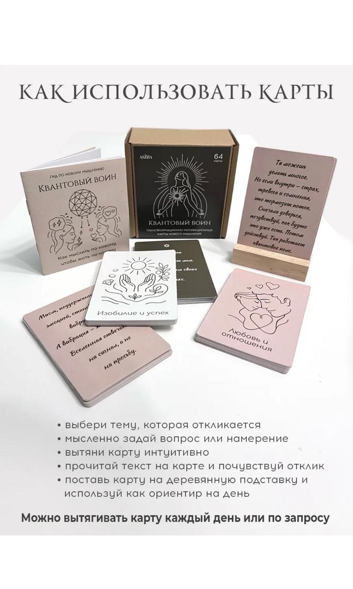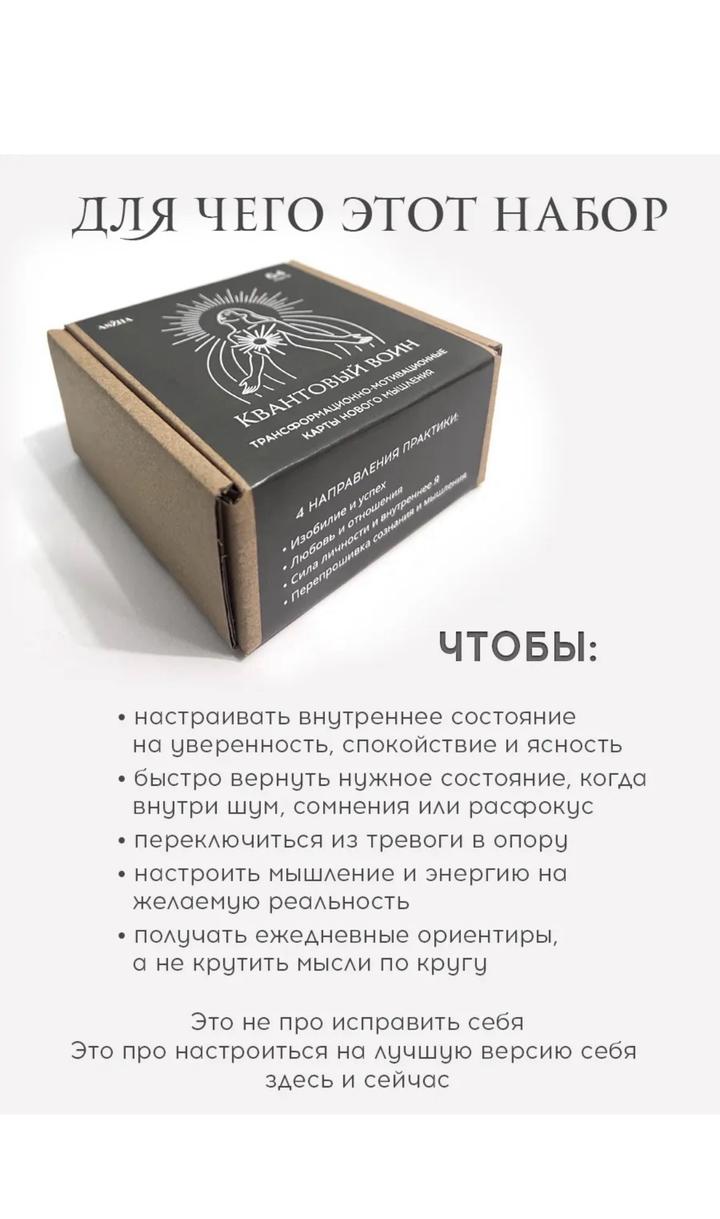 Трансформационные карты «Квантовый воин» — инструмент для перепрошивки мышления и внутренней силы Трансформационные карточки «Квантовый воин» — это набор из 64 карт с мотивационными аффирмациями и посланиями,созданный для саморазвития,повышения уверенности, работы с мышлением и состоянием изобилия.Карты помогают менять внутренние установки,фокусироваться на возможностях,усиливать веру в себя и осознанно формировать желаемую реальность.Подходят для самостоятельной практики, ежедневных ритуалов Артикул: 541619