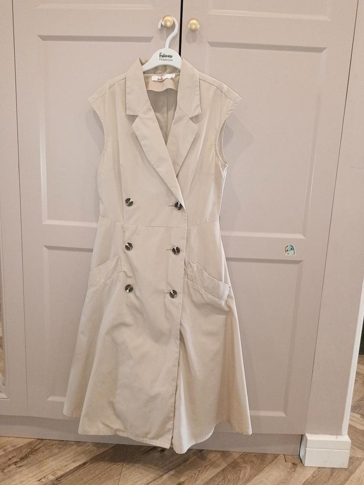 Лёгкое летнее платье-жакет с двубортной застёжкой на пуговицах - идеальный вариант для комфортного женственного образа на каждый день. Приталенный силуэт, длина до колена, отложной воротник с лацканами, треугольный вырез с запахом, без рукавов, двубортная застёжка на пуговицах, боковые карманы, съёмный тканевый пояс в комплекте. Артикул: 541862