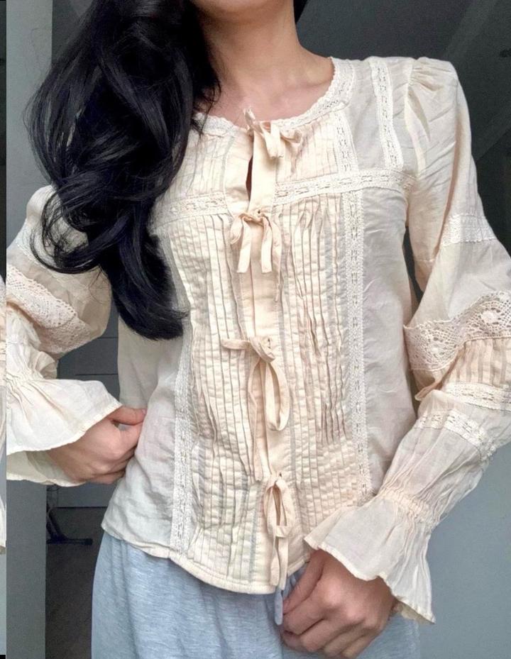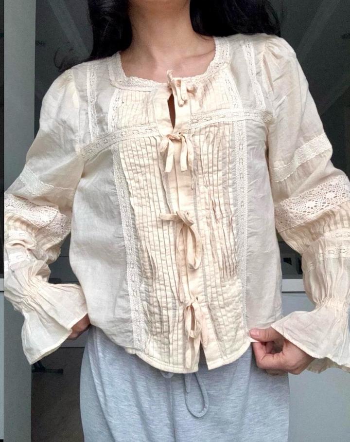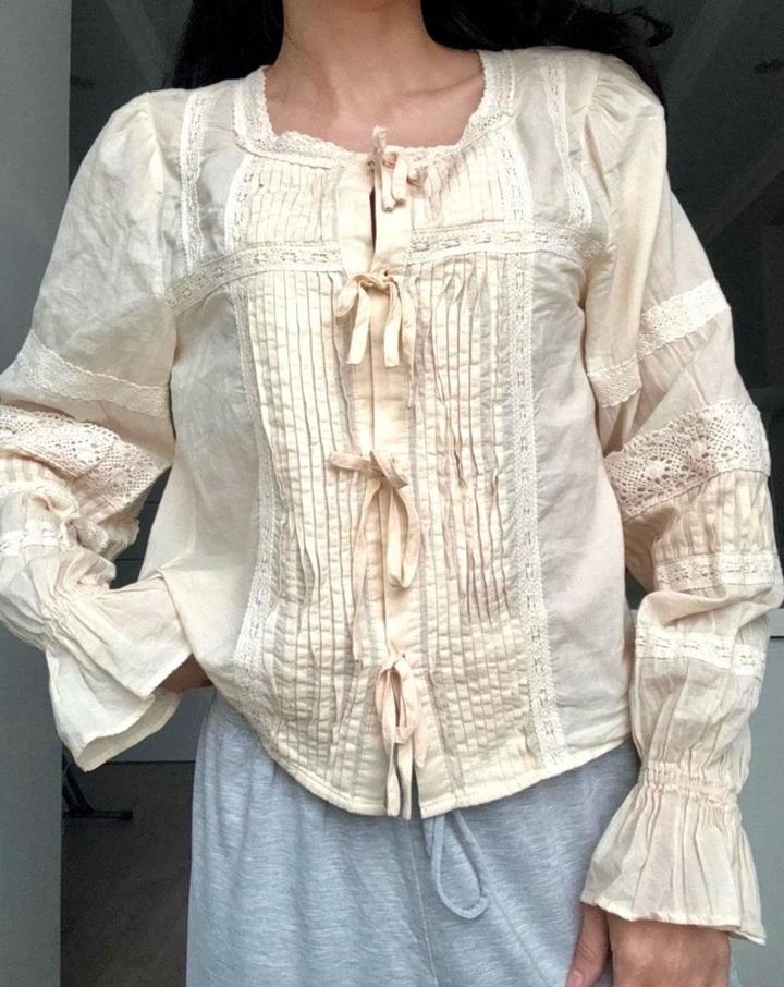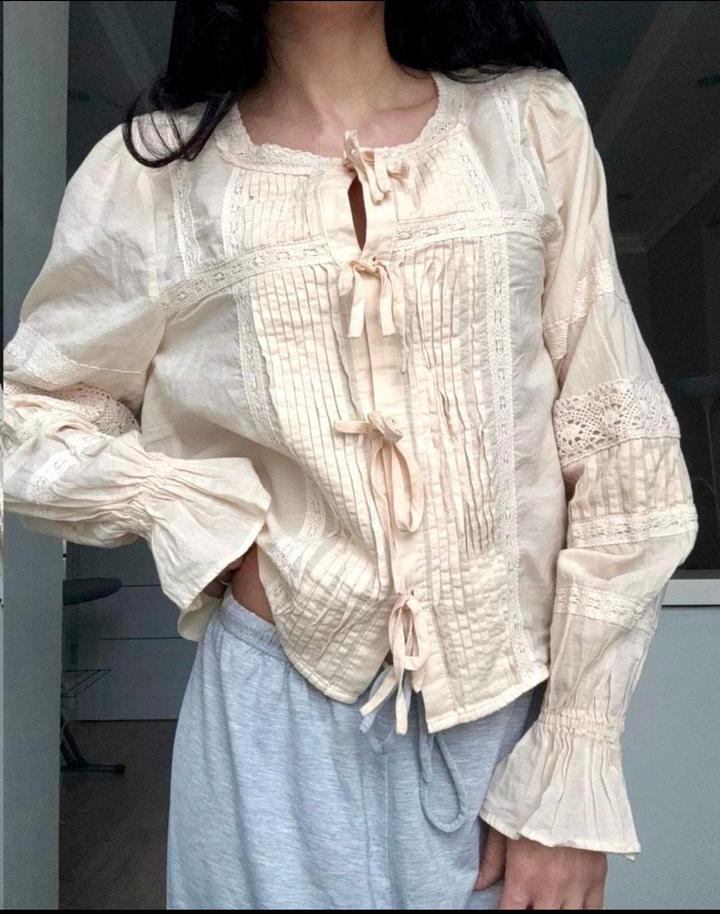 Нежная блуза в винтажном стиле из лёгкой ткани молочного оттенка с декоративными защипами и кружевными вставками. Модель украшена завязками спереди и объёмными рукавами с манжетами, создающими романтичный силуэт. Артикул: 541955