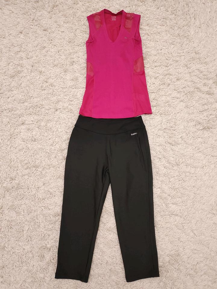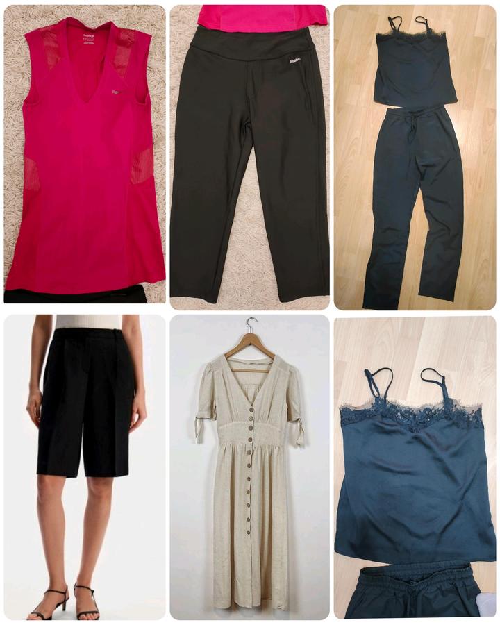 Женские вещи пакетом (размер S): Розовая майка reebok, черные спортивные леггинсы длина 3/4 reebok, черный комплект из атласной ткани - топ и штаны, черные шорты бермуды, летнее платье cropp, все в отличном состоянии. Артикул: 542165