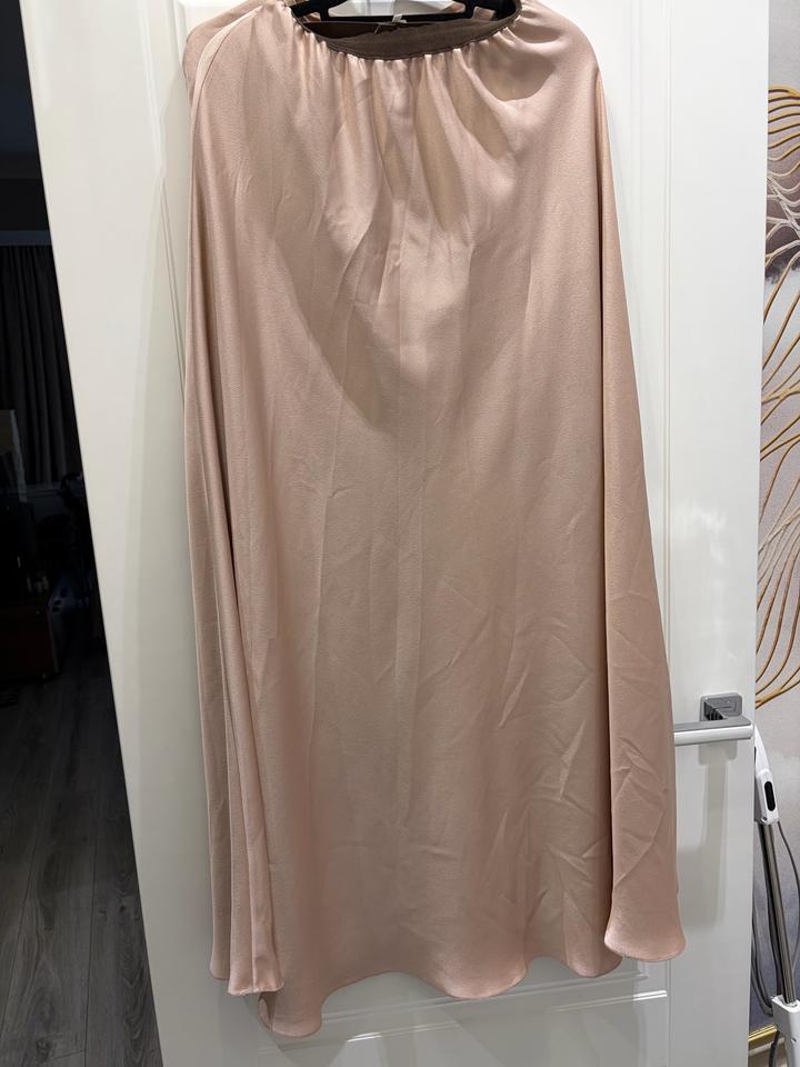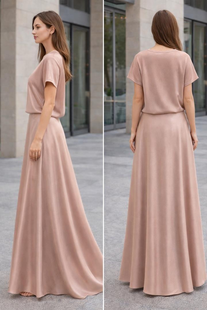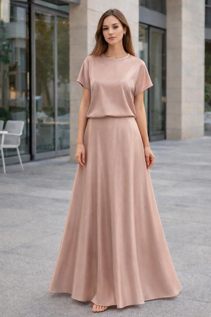 Нежный комплект в оттенке пудры футболка + юбка в пол Легкая струящаяся ткань с деликатным сиянием Футболка свободная, цельный реглан рукав, без швов и карманов Юбка макси, красиво ложится, резинка не утяжеляет силуэт Размер: L (сядет на M–L) Состояние: нового Артикул: 542404