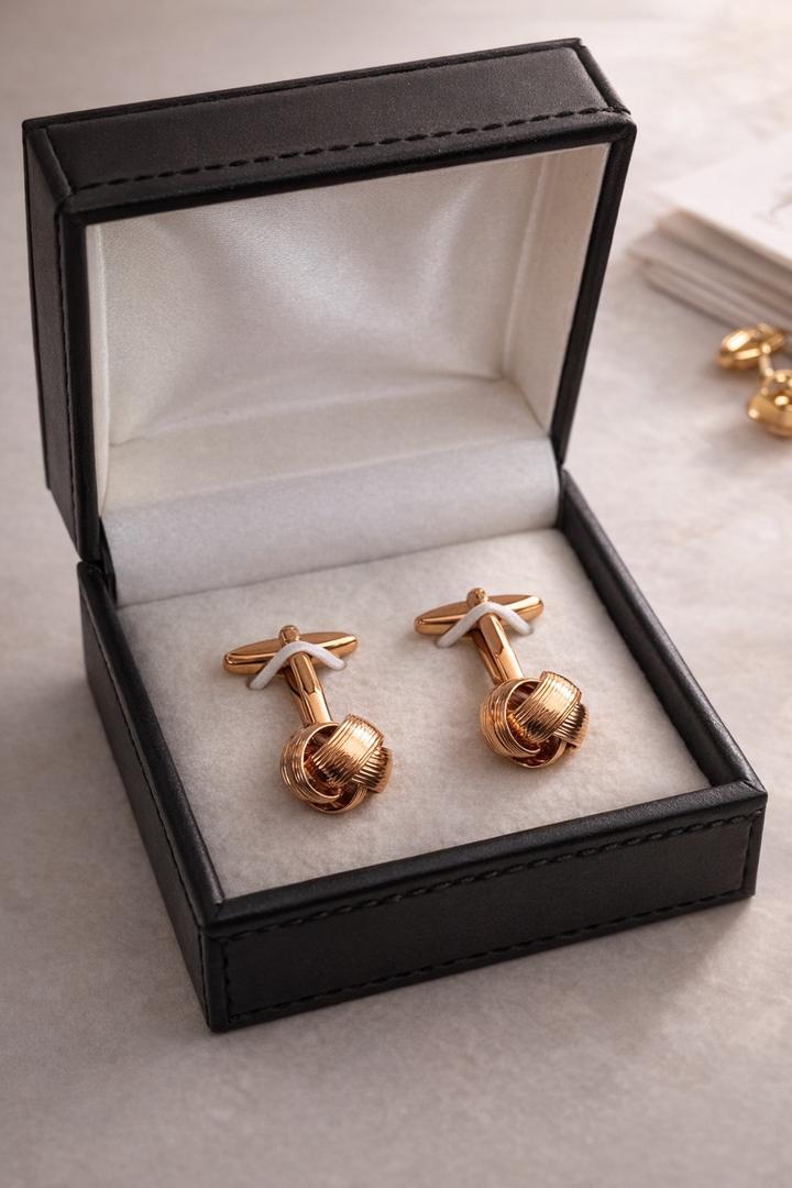 Стильные мужские запонки с оригинальным дизайном в форме узла — символ уверенности, силы и безупречного вкуса. Идеально дополняют деловой образ, придают статус и завершённость любому костюму. Подойдут: — для офиса и встреч — на мероприятия и торжества — как подарок ✨ Преимущества: • эффектный дизайнерский узел • благородный золотой оттенок • выглядят дорого • новые, в коробке Отличный выбор для мужчины, который ценит стиль Артикул: 542524