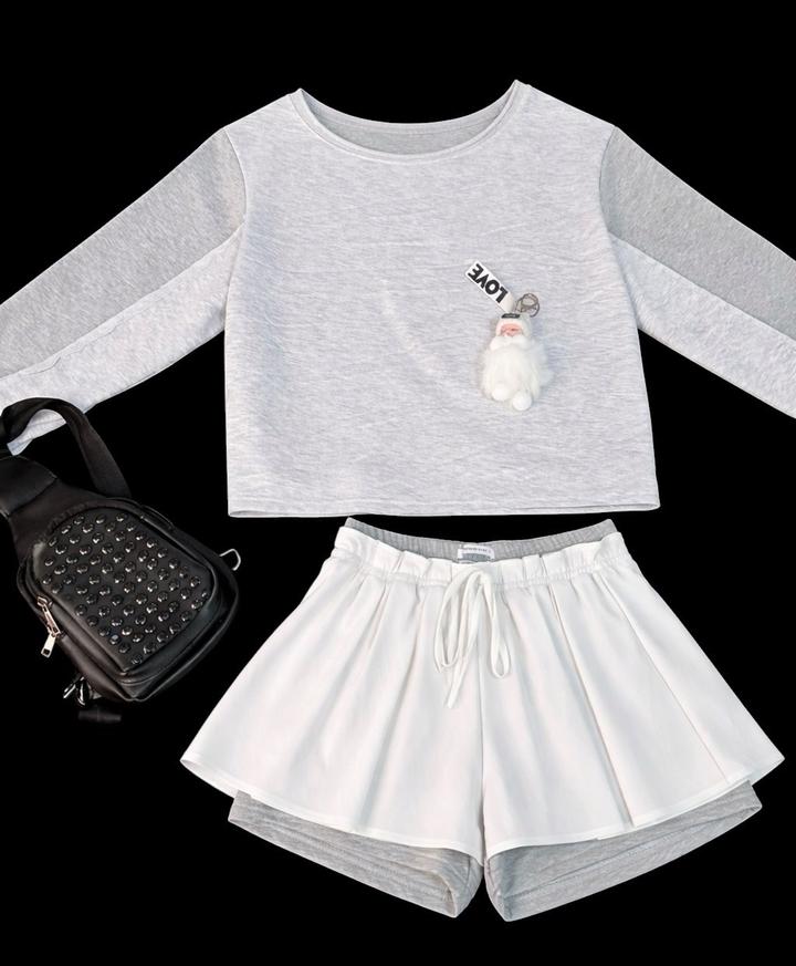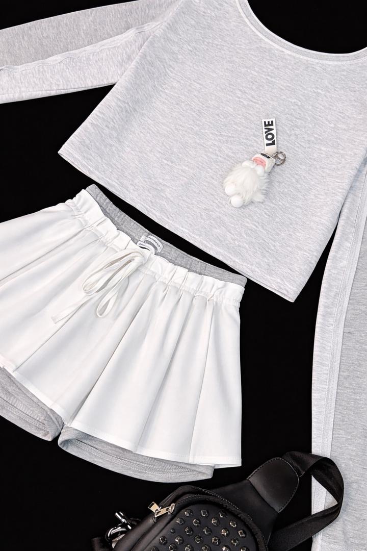 Костюм женский двойка с юбкой-шортами и кроп-лонгсливом серо-белыйS