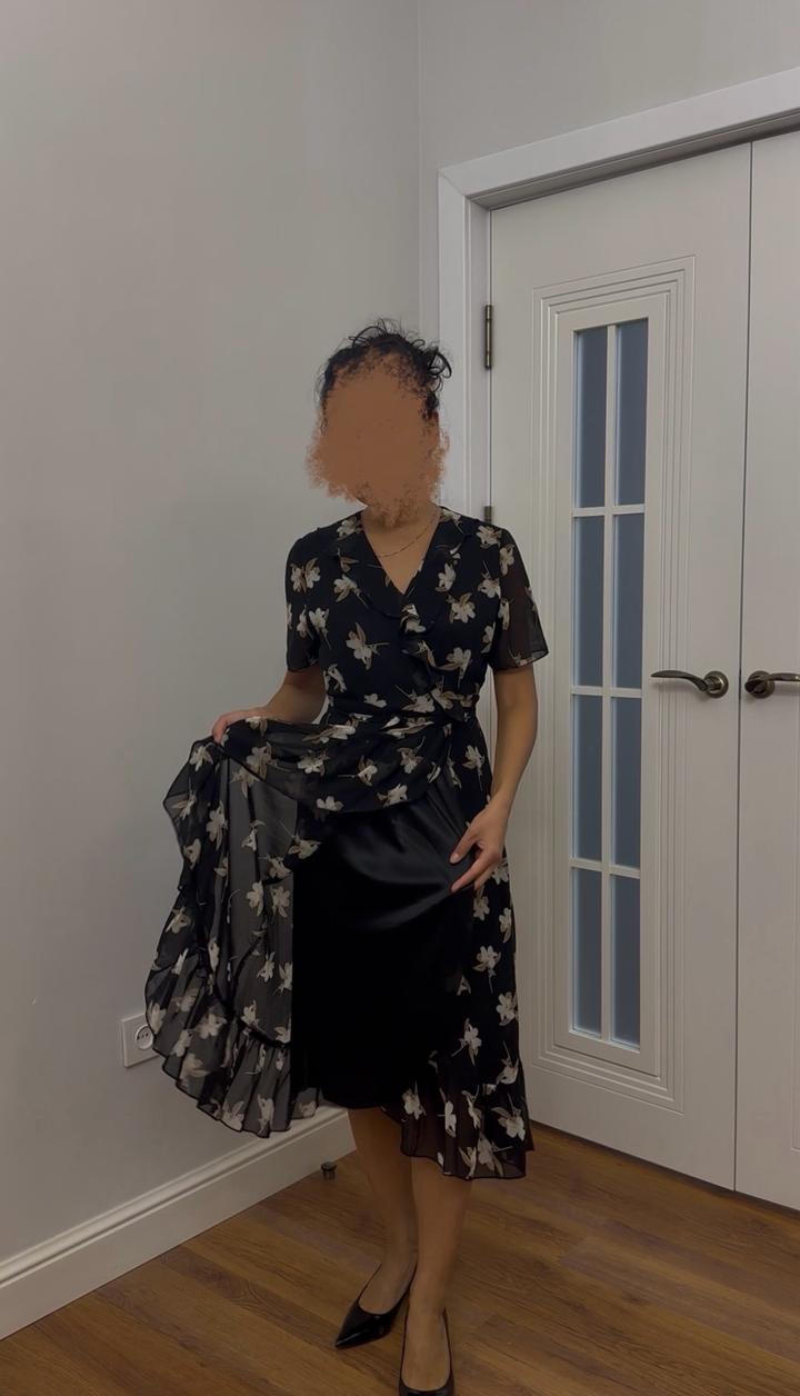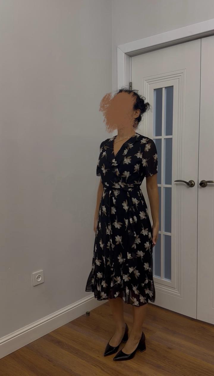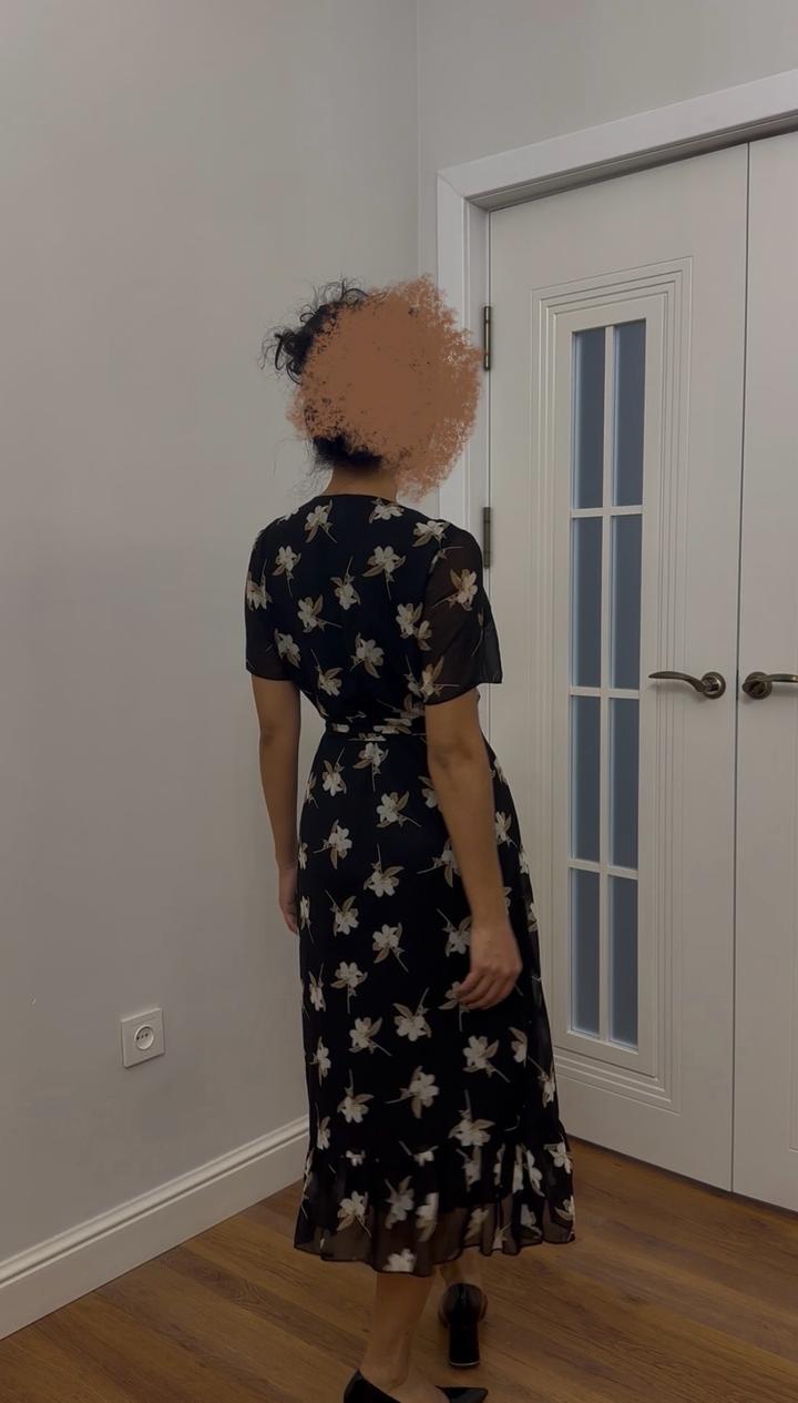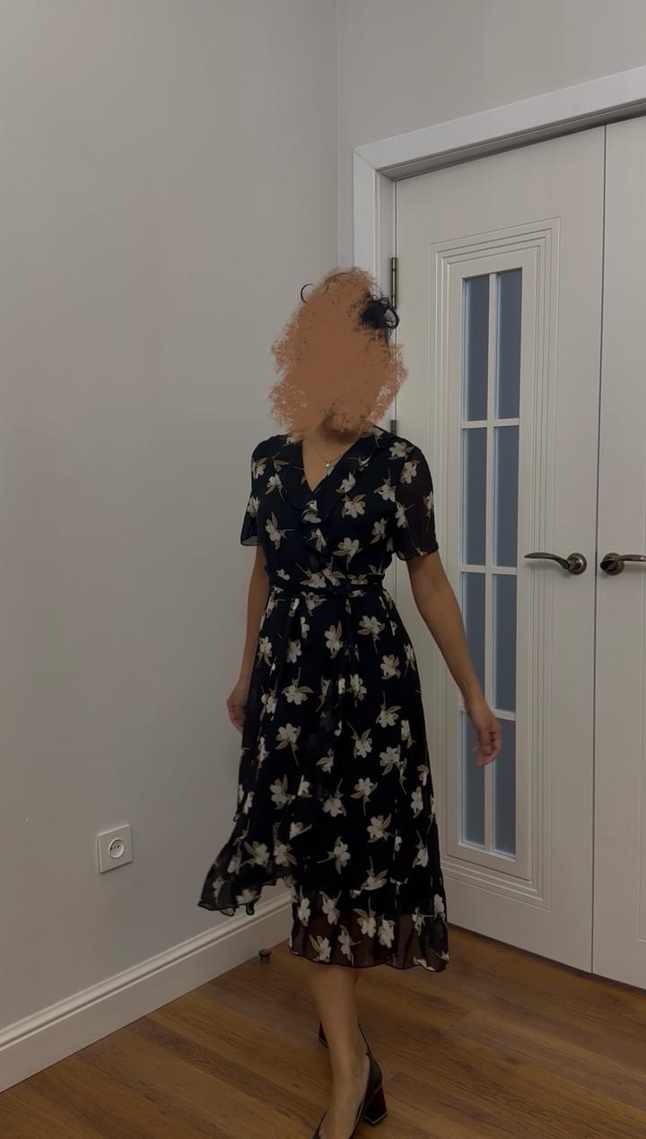 Летнее чёрное платье на запах 🖤 Лёгкая струящаяся ткань, приятное к телу. Цветочный принт добавляет нежности и женственности. Фасон на запах красиво подчёркивает талию, длина миди — универсально на каждый день и на выход. Есть подклад. Состояние: отличное Артикул: 542751