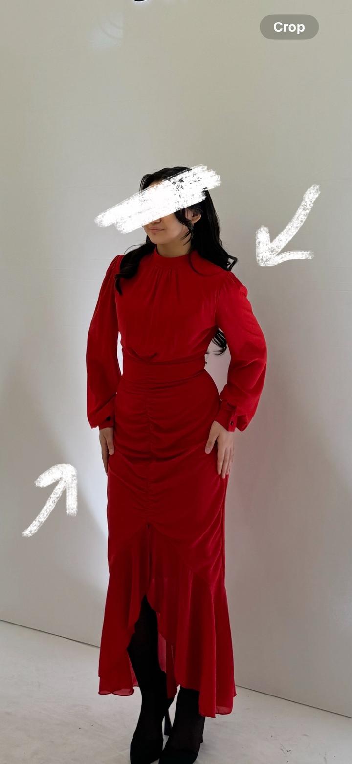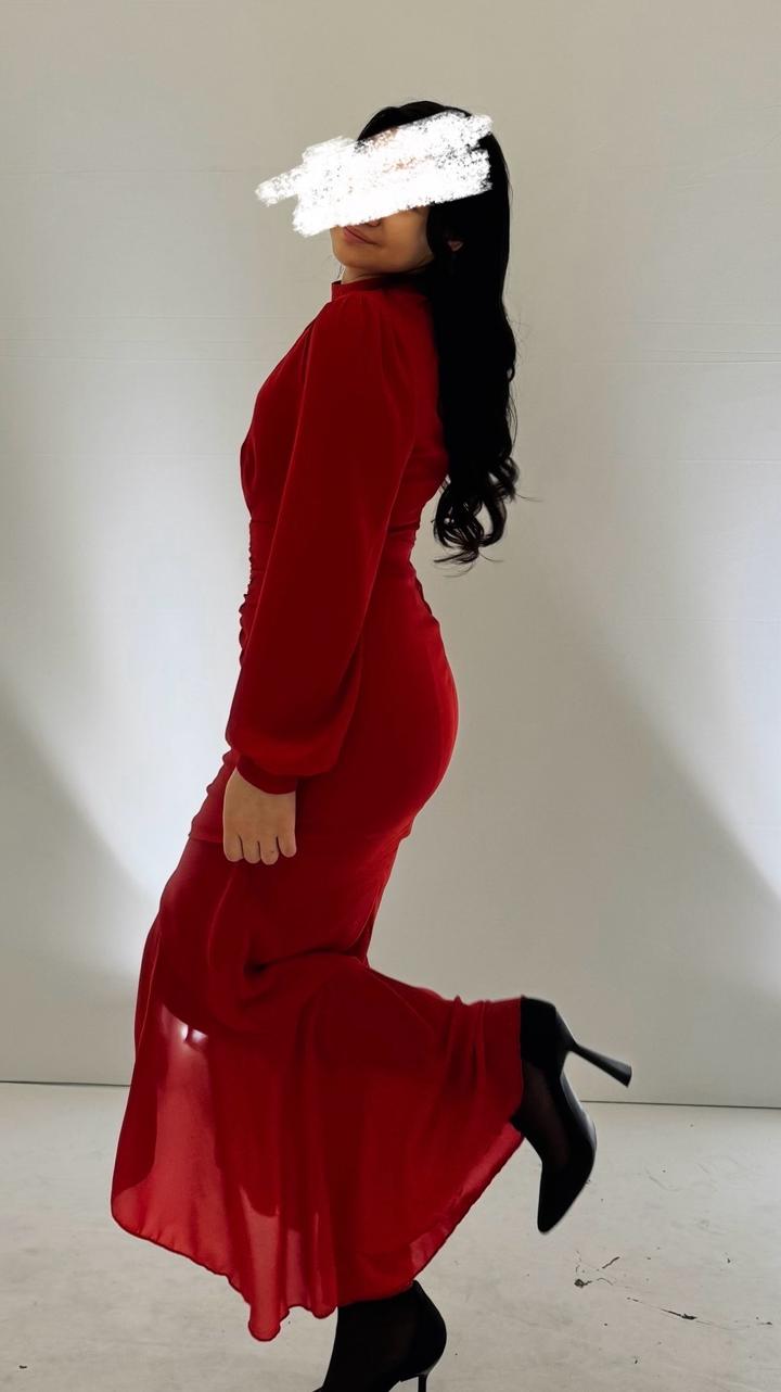 Это элегантное красное платье макси. Оно имеет закрытый вырез и длинные объемные рукава, переходящие в ман+7### ### ## ##лько один раз, состояние очень хорошее🫶🏻 Артикул: 542794