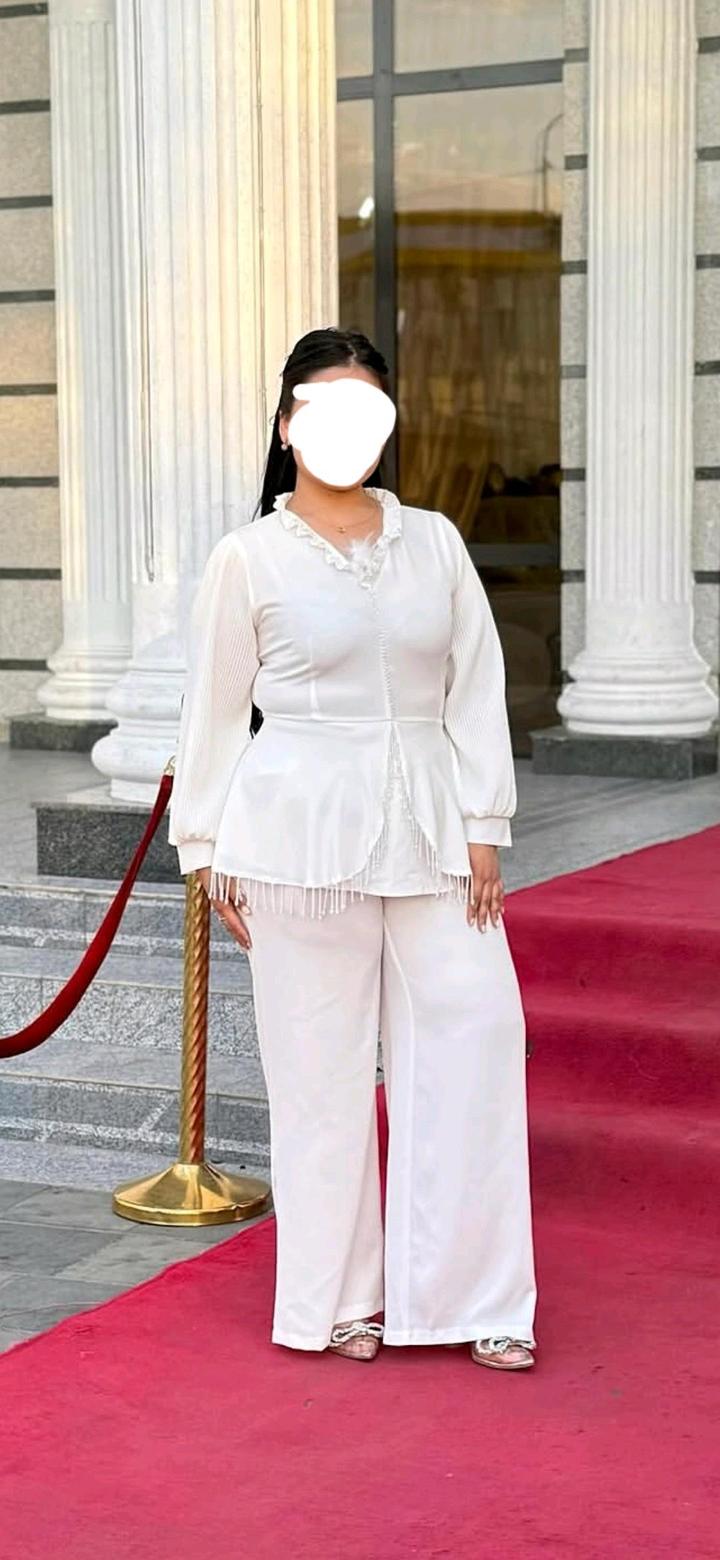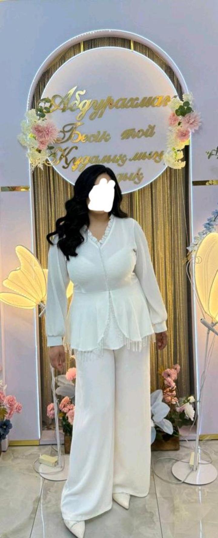 Продам элегантный праздничный костюм в идеальном состоянии. Надевался всего один раз на торжество. Цвет — чистый белый, выглядит очень эффектно и освежающе. Особенности модели: Верх: Удлиненный топ с баской, который отлично подчеркивает талию. Рукава со сборками и красивая отделка бахромой по нижнему краю. Брюки: Свободный крой (палаццо), визуально удлиняют ноги и создают летящий силуэт. Размер: 52. Костюм идеально подойдет для «Құдалық», «Ұзату», свадьбы или любого другого важного мероприя Артикул: 542796