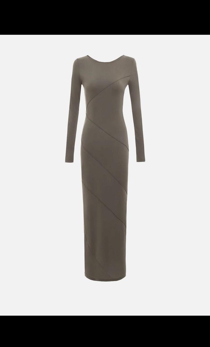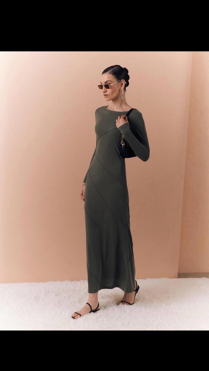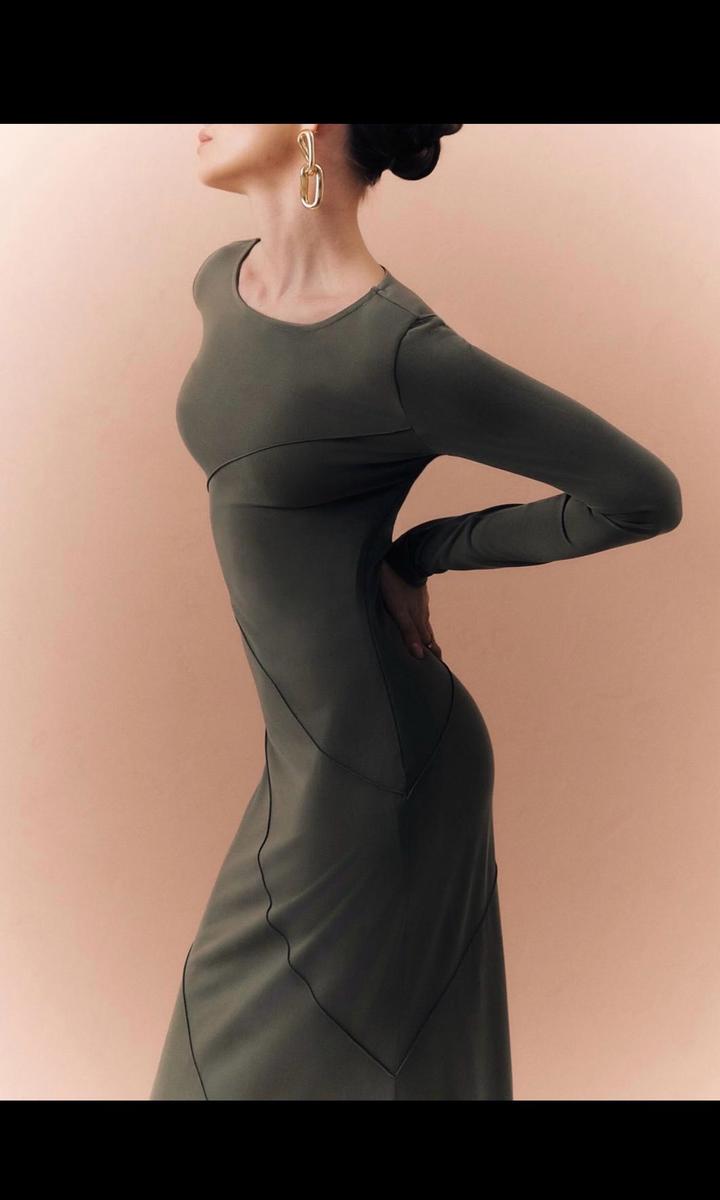 Приталенное платье макси с круглым вырезом, прилегающими длинными рукавами и свободной расклешенной юбкой, выполненное из гладкого трикотажа и дополненное декоративными диагональными швами спереди. Длина макси, длинные рукава Диагональные швы, расклешенная юбка Артикул: 542849