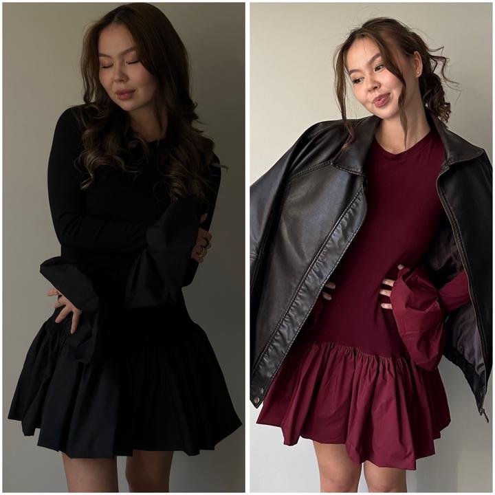 Мини платье колокольчик на вечер и на повседневную носку Расцветки: Бордо, черный Размеры: С, М 2 бордовых платья в размере М 6000тг Новый товар раньше продавались по 15.000 Артикул: 542983