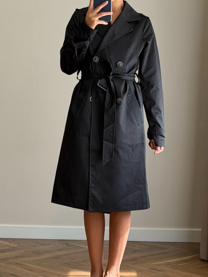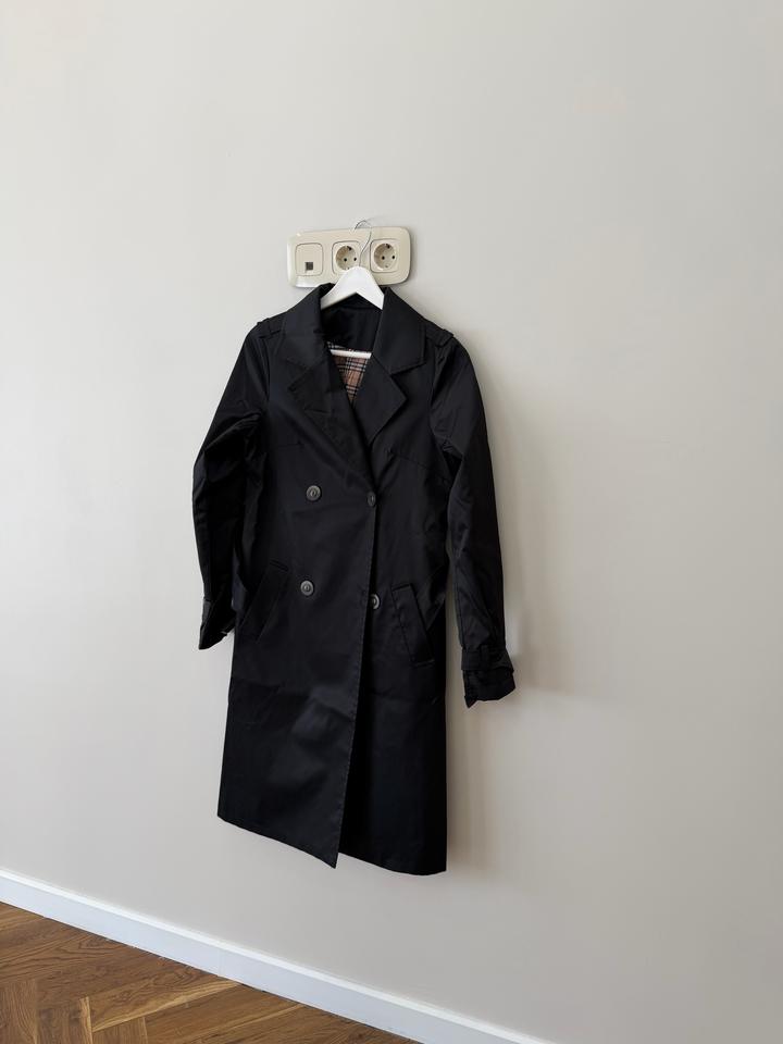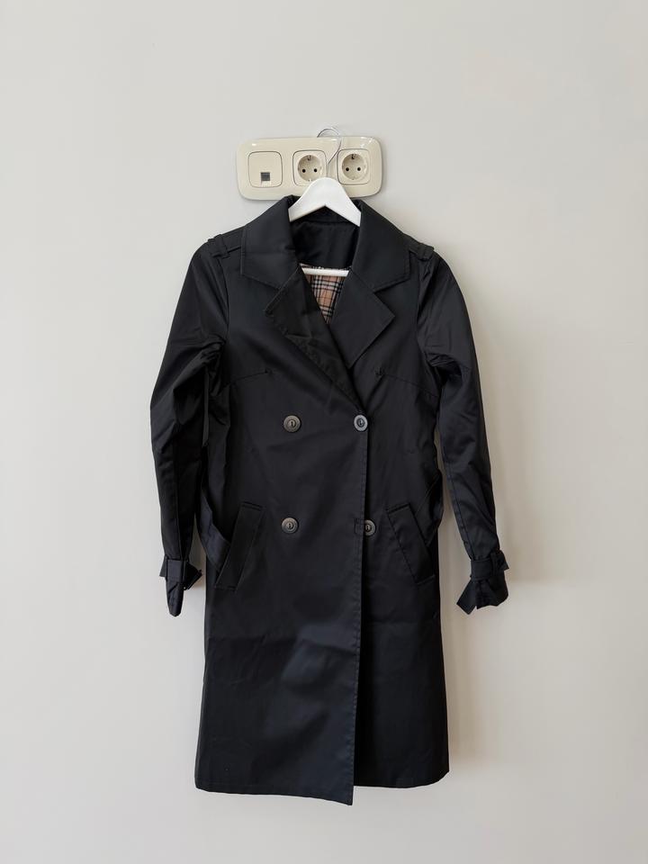 Черный тренч от корейского бренда. Размер S/XS. В идеальном состоянии. Все пуговицы и швы на месте. Носилось один сезон. На подкладке на небольшом участке отошли швы (исправимо и некритично🤭). У меня рост 158 см, длина на фото. Артикул: 543778