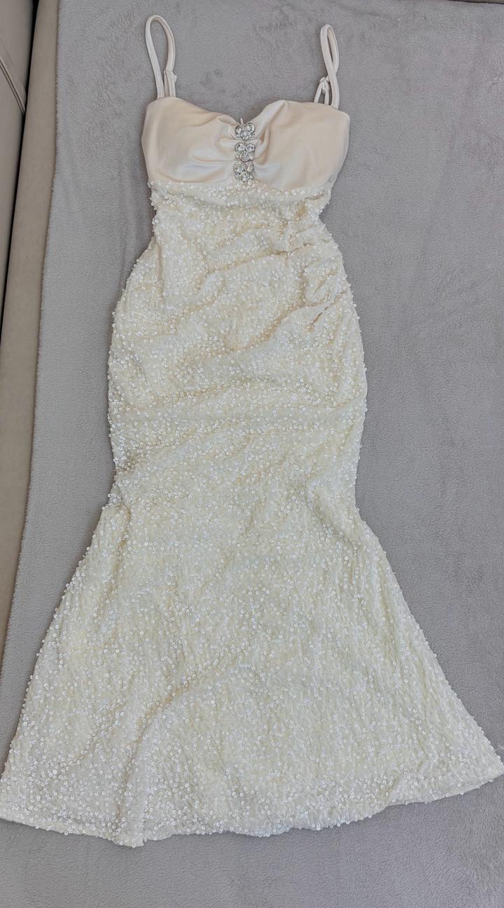Продаю элегантное белое платье, надевала всего 1 раз. Идеально для дня рождения, фотосессии или особенного вечера 💫 вечера 💫 — Цвет: нежный белый (айвори) — Материал: качественный, с лёгким благородным блеском — Декор: пайетки + стразы на груди — Фасон: подчёркивает фигуру, выглядит очень дорого — Состояние: отличное, без заметных дефектов 🎁 В ПОДАРОК: лёгкая накидка (шифоновый кейп) в тон — придаёт образу ещё больше нежности и роскоши Артикул: 544050