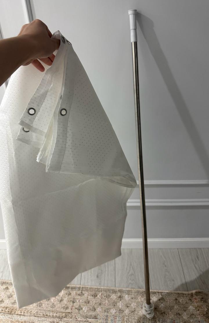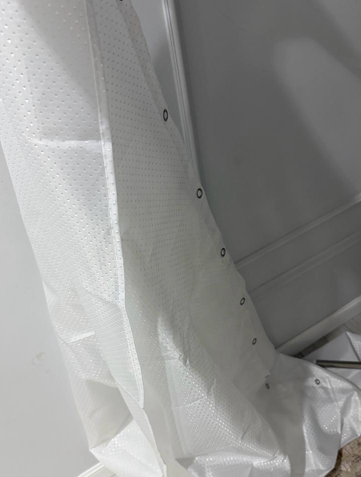 Шторка из непромокаемой водоотталкивающей ткани специально для ванной, размер 2м на 2м. Карниз почти 3м, размер регулируется. Кажется до 2.8м. Состояние почти новое, пользовались совсем мало. Постиранные, чистые. Артикул: 544687