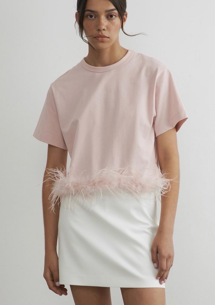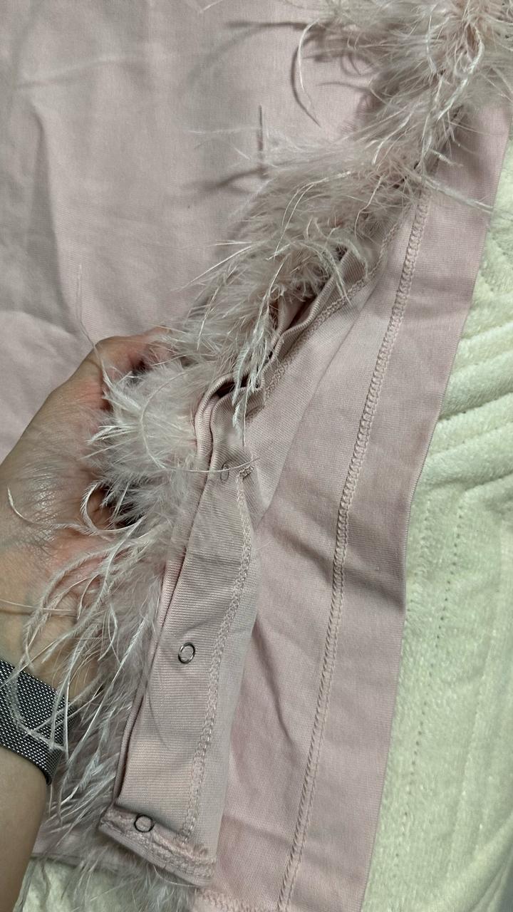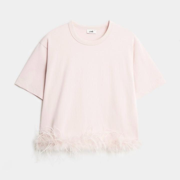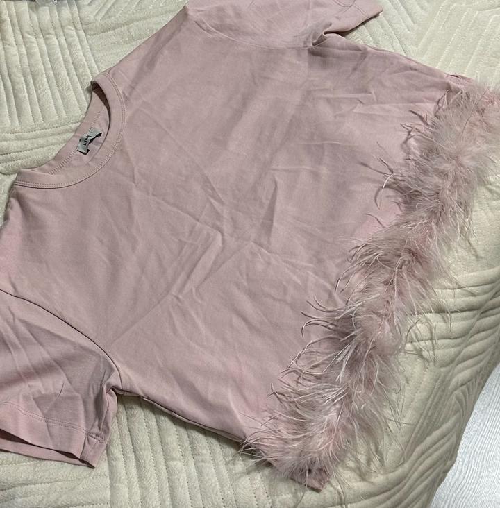 Lime футболка укороченная с перьями Перья отстегиваются Цвет пыльно розовый Размер указан Л, но пойдет на С-М-Л Очень нарядно и стильно смотрится На фото надо отпарить, мне лень) Артикул: 544850