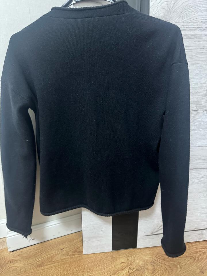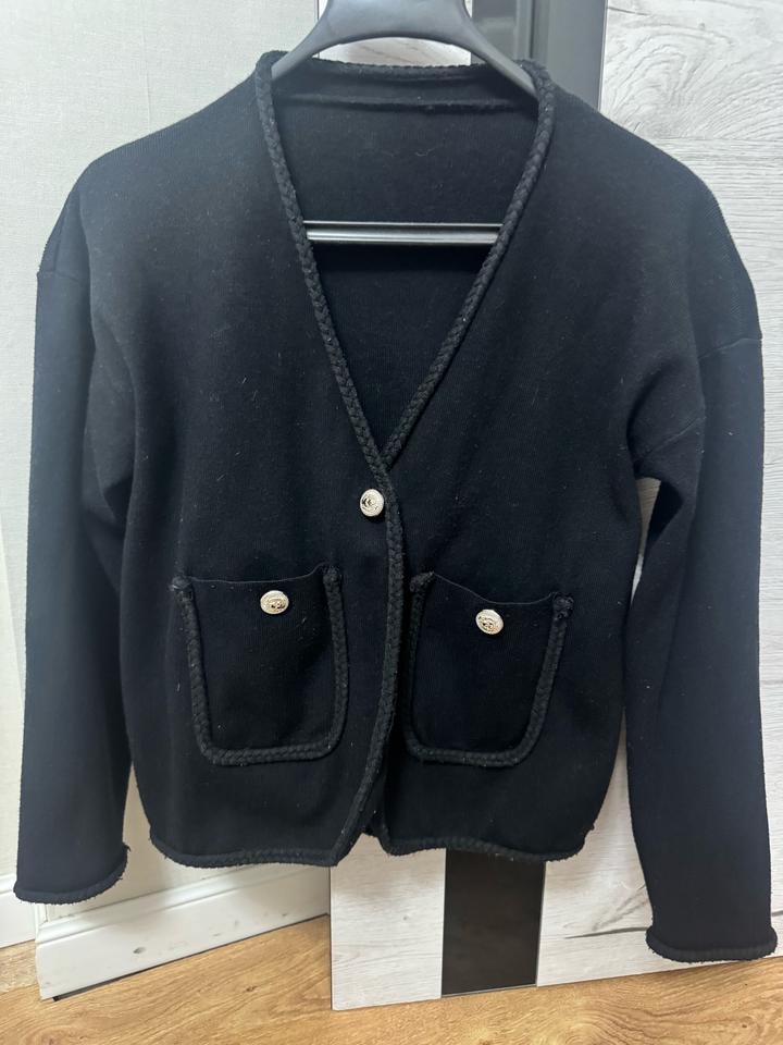 Кардиган черного цвета, состояние отличное, пуговки пришиты хорошо, по краям плетенка Артикул: 545126