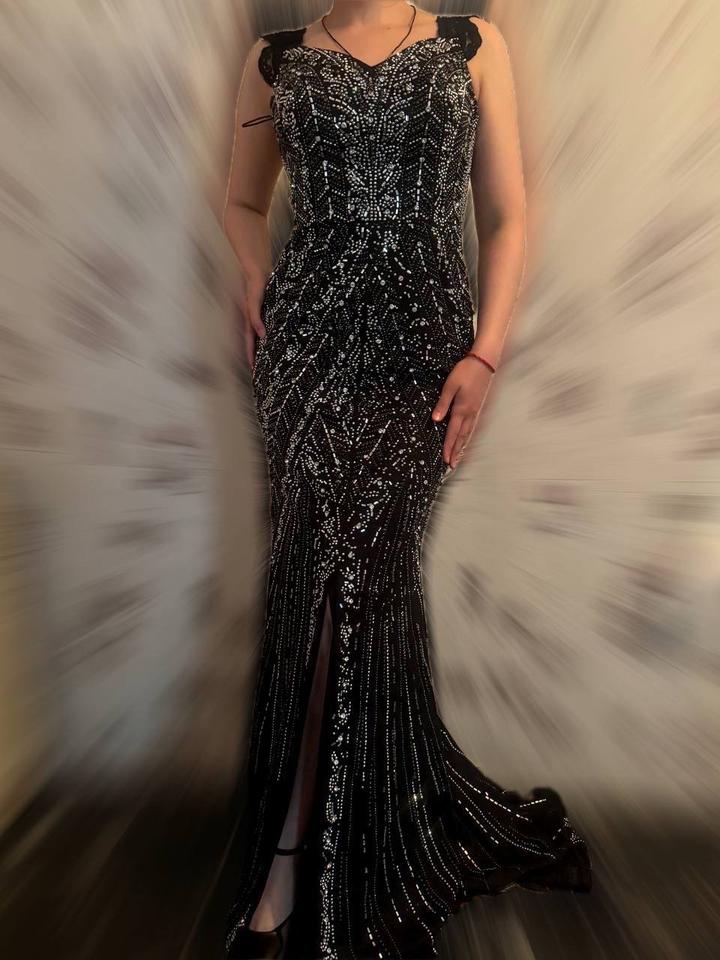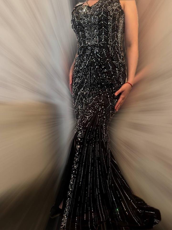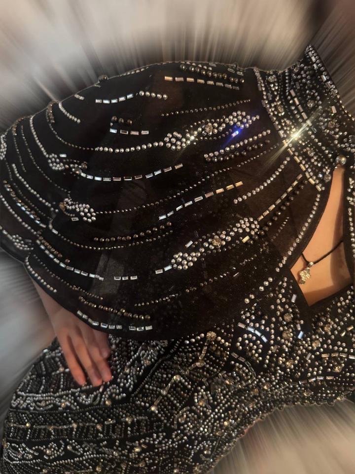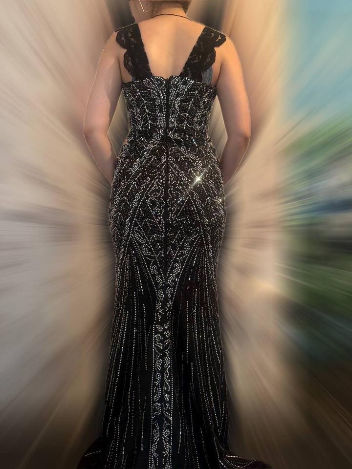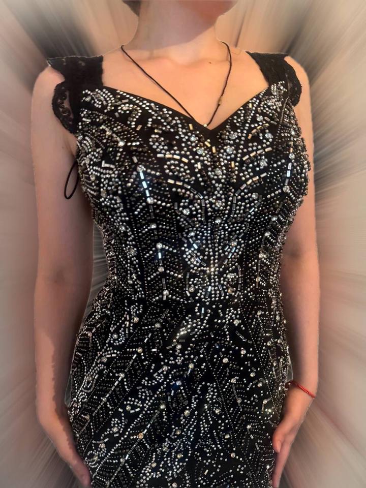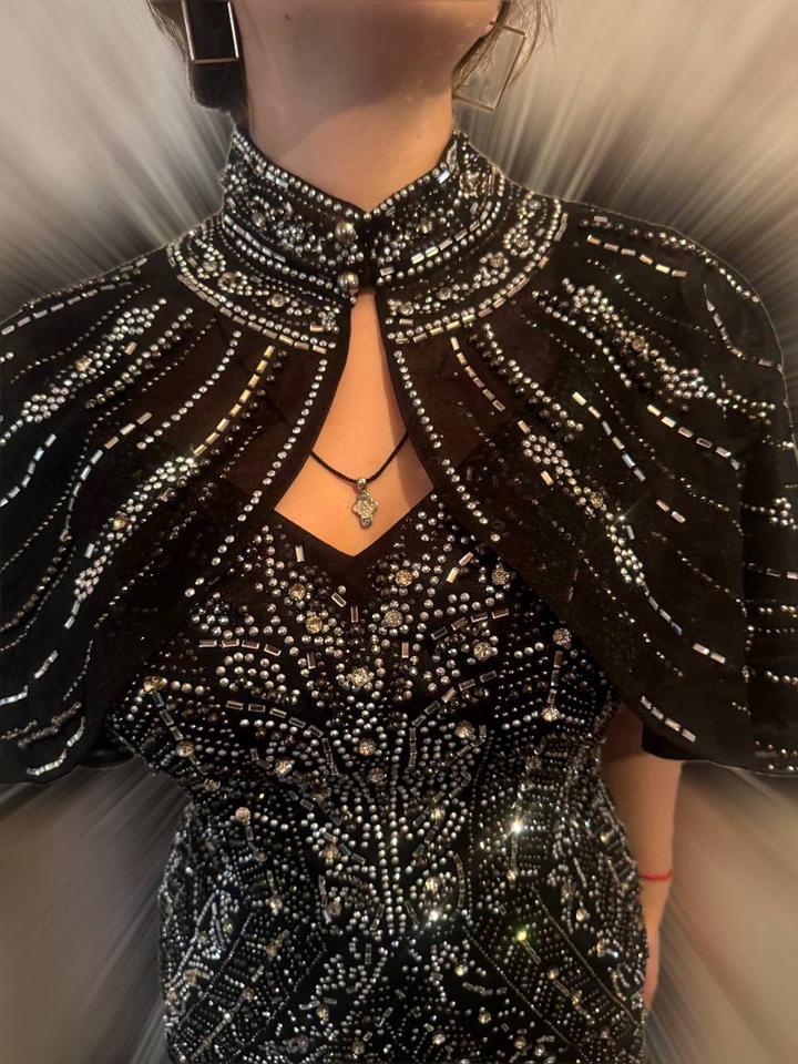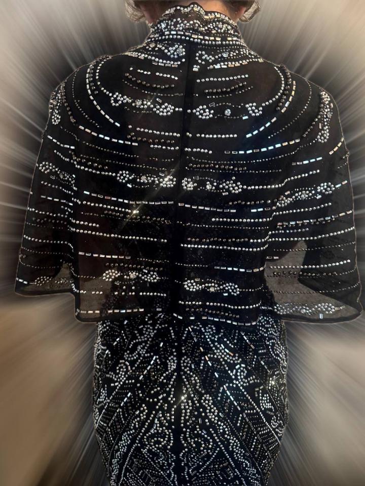 Черное платье 44-го размера. Обшито полностью стразами, ручная работа. Имеется накидка, можно и без накидки. Было надето один раз на 4-6 часов, без единого дефекта. Артикул: 545695