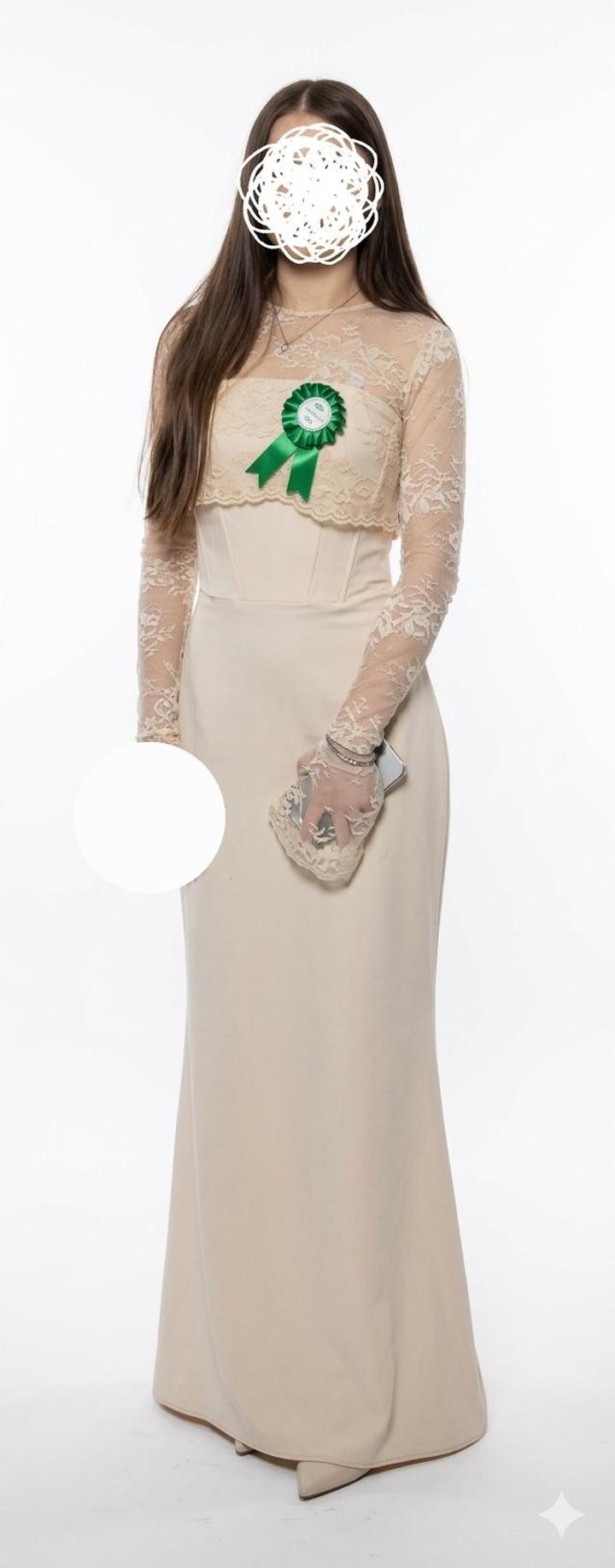 Бежевое платье,троика,сзади на завязках (корсетный), Размер:42-44 Длинна: макси (рост на фото 164 см) Состояния хорошее,носили 1раз на той. Артикул: 546039