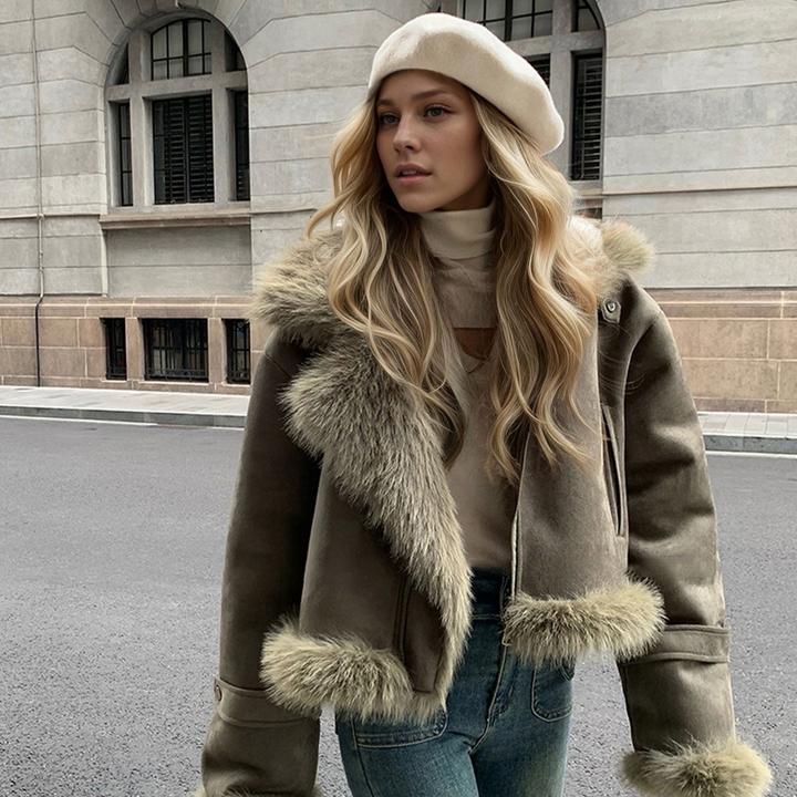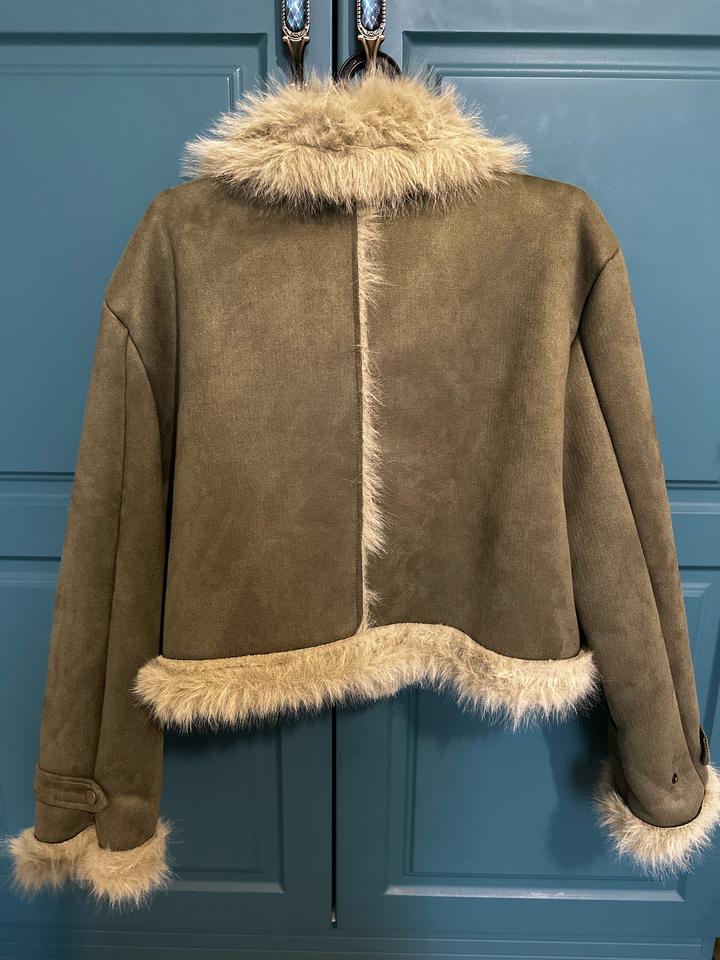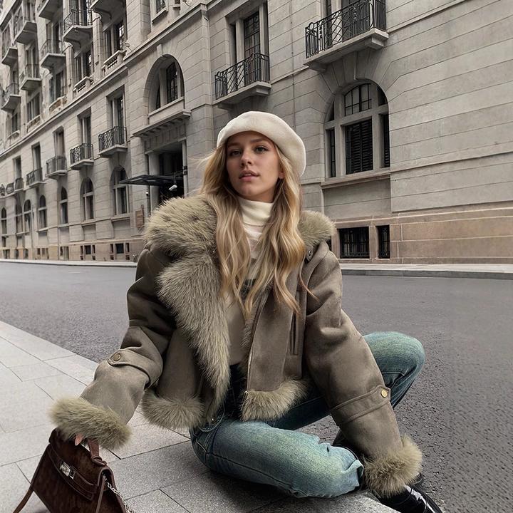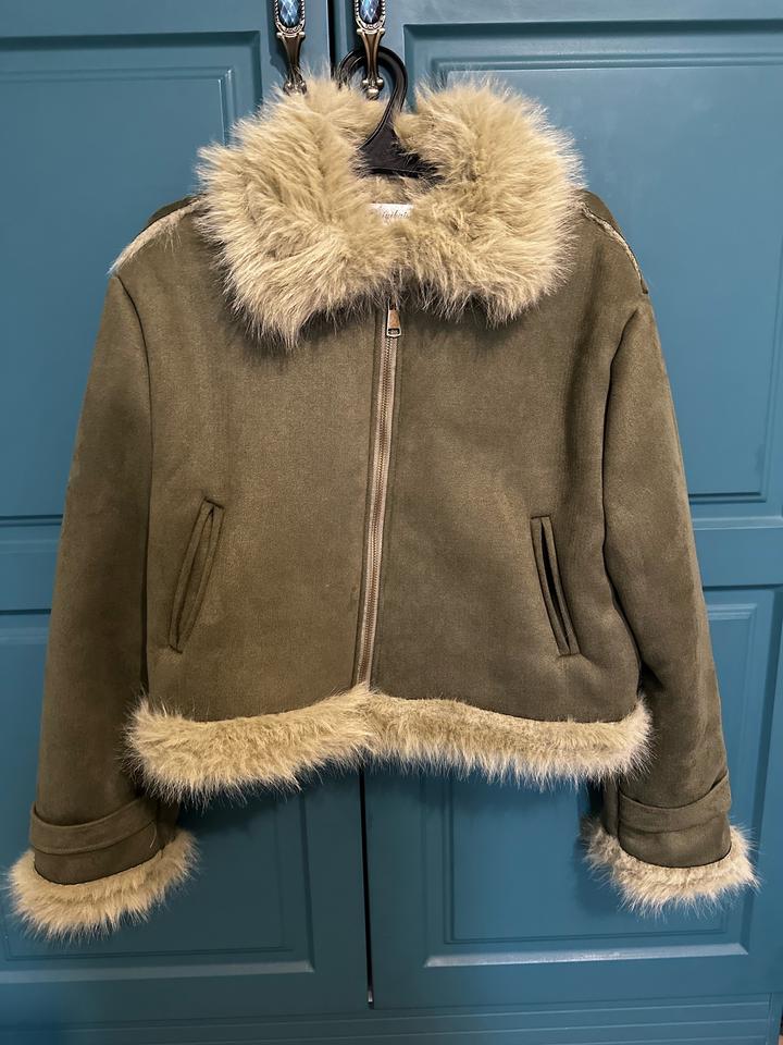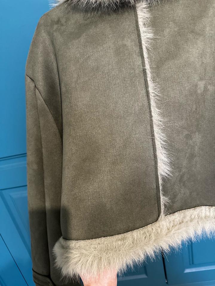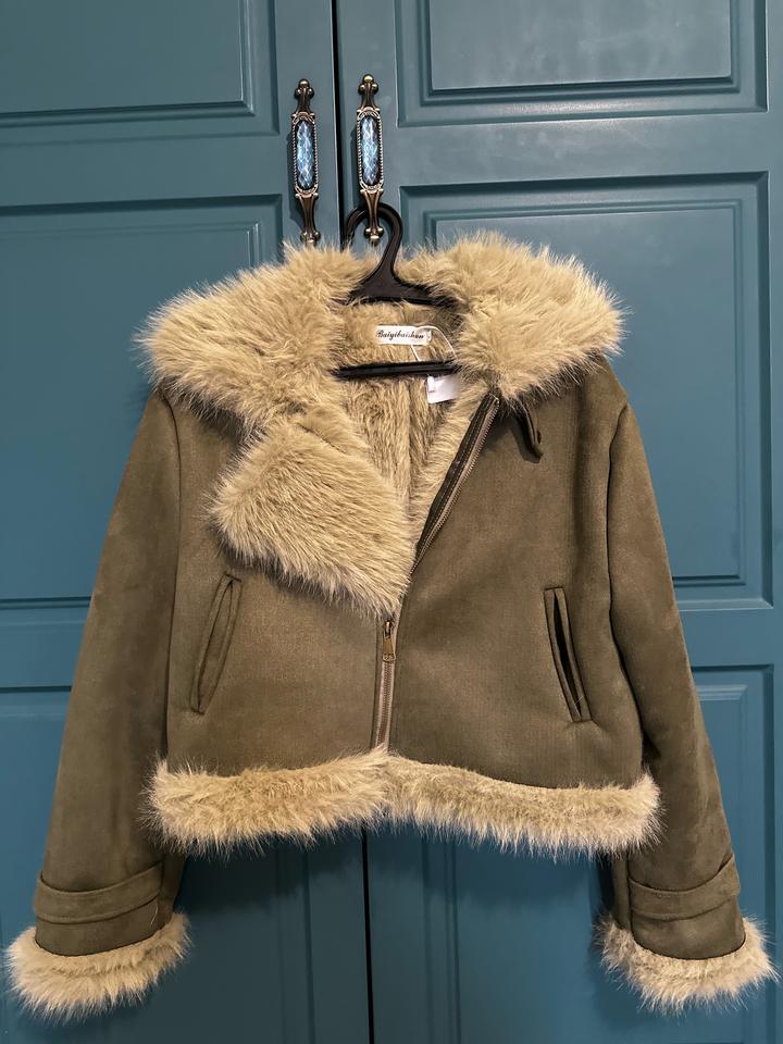 Дубленка в цвете хаки на осень. Материал приятный, мягкий, смотрится стильно и ординарно. Единственный минус в том, что на одежде остаётся шерсть. Артикул: 546900