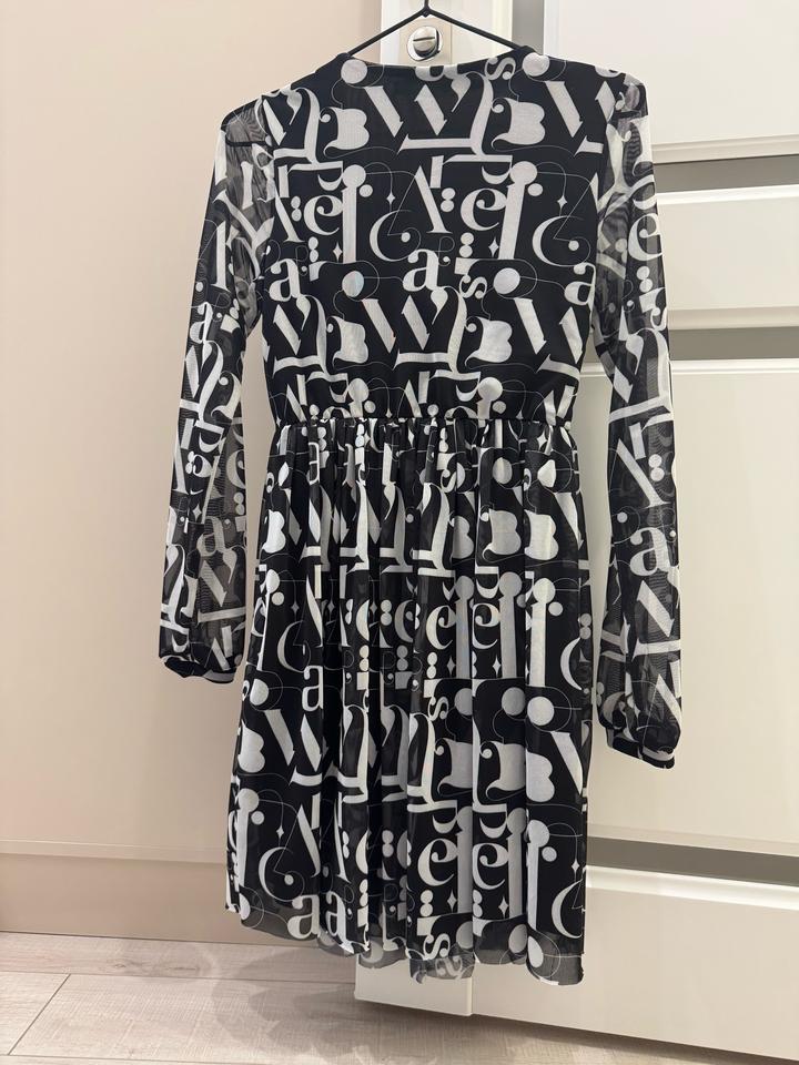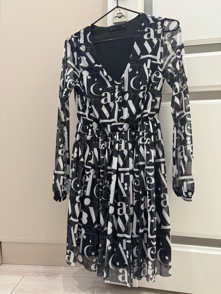Лёгкое женское платье чёрного цвета с белым абстрактным принтом.Рукава длинные, полупрозрачные, с мягкими манжетами. Размер xxs, большемерит немного.Носилось 1 раз на вечер. Артикул: 546946