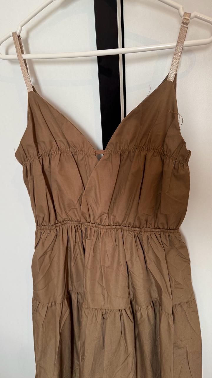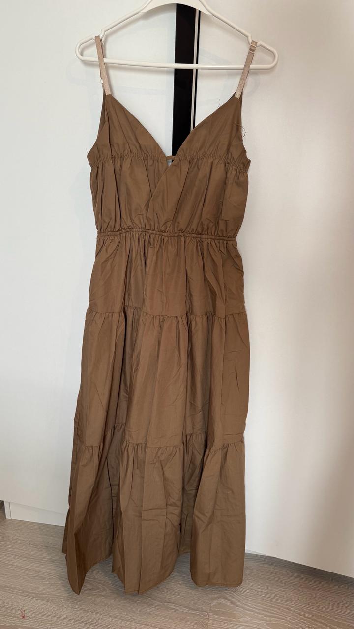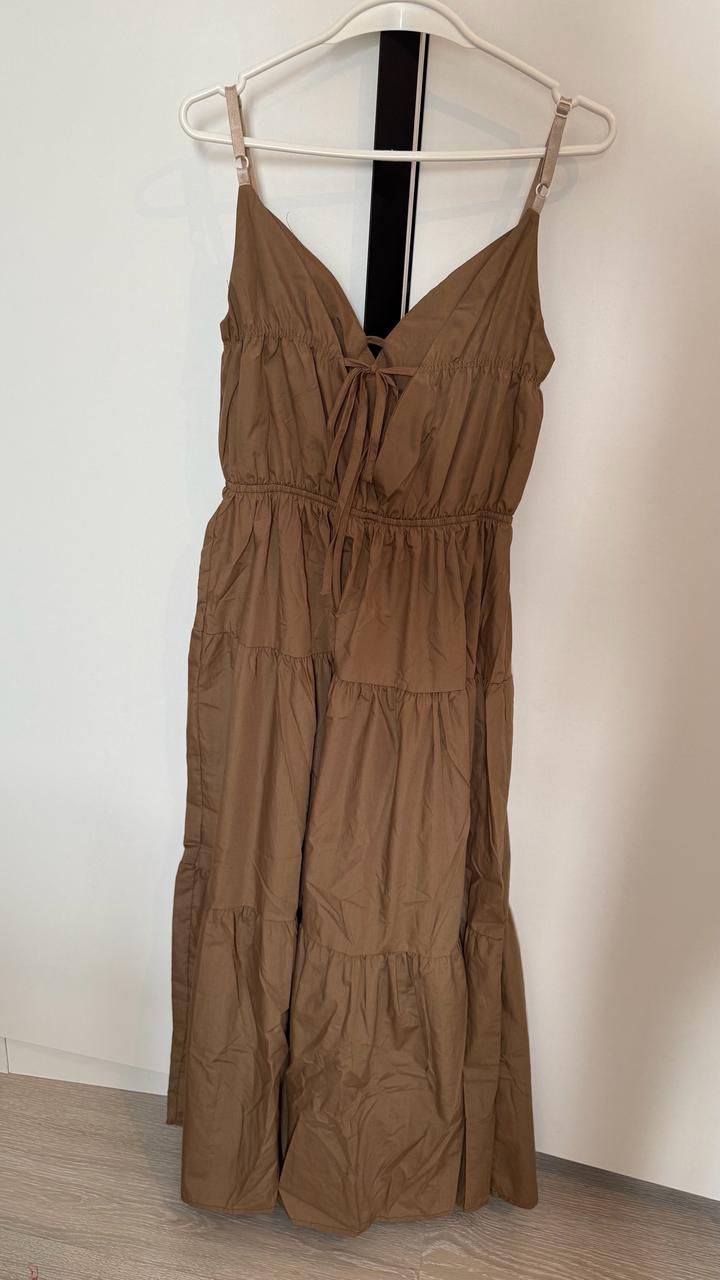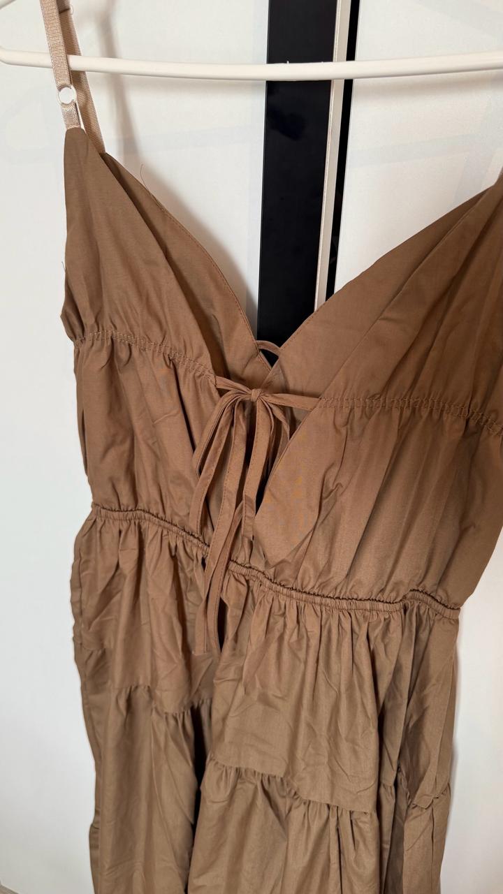 Коричневая платье миди 🤎 Нежное и женственное платье — идеальный вариант на лето, прогулки и фотосессии 📸 • Тонкие регулируемые бретели • Красивый вырез с завязками на груди • Свободный, воздушный крой • Многоярусная юбка — смотрится очень легко и стильно • Лёгкая ткань, приятно к телу Подойдёт с сандалиями, кедами или каблуками Артикул: 546954