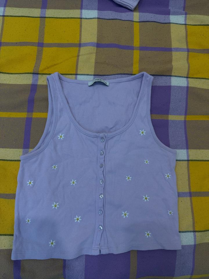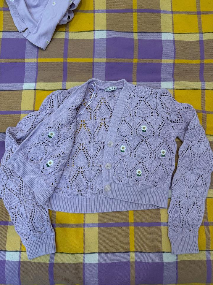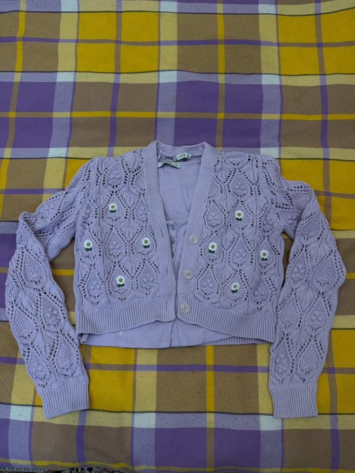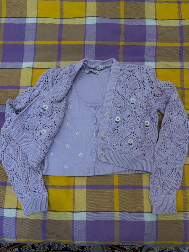 Нежный комплект в светло-лавандовом цвете: укороченный кардиган и топ. Кардиган ажурной вязки с декоративными узорами и пуговицами, топ на пуговицах с милым цветочным принтом (ромашки). Отлично смотрятся как вместе, так и по отдельности. Подойдёт на размер S–M. Состояние очень хорошее, качественная вещь. Артикул: 547079
