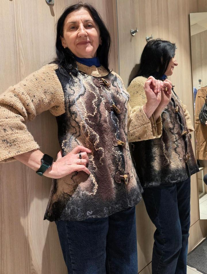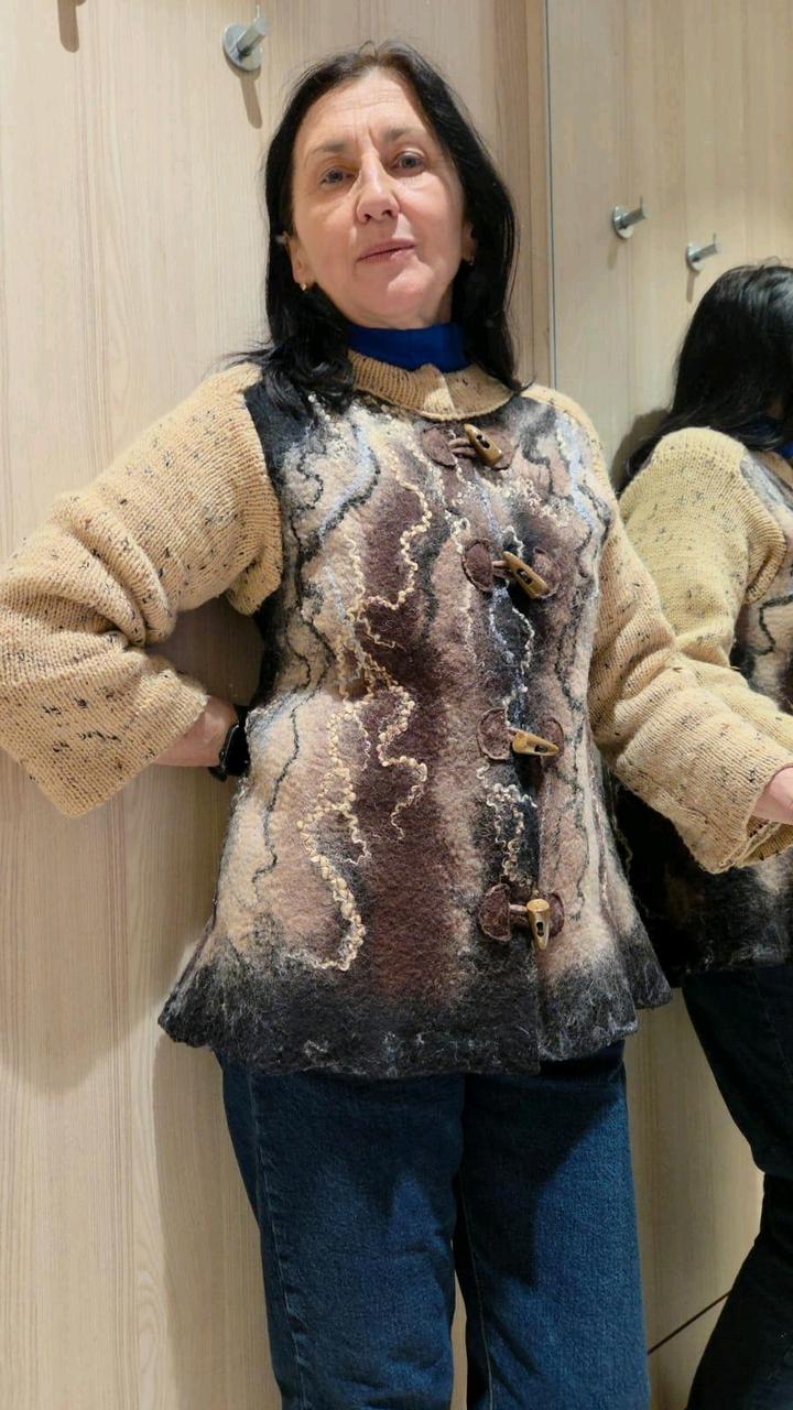 Кардиган- основа декоративное валенное (меринос шерсть 100 проц)полотно, рукава и ворот -вязанный трикотаж, модная застежка. Артикул: 547239