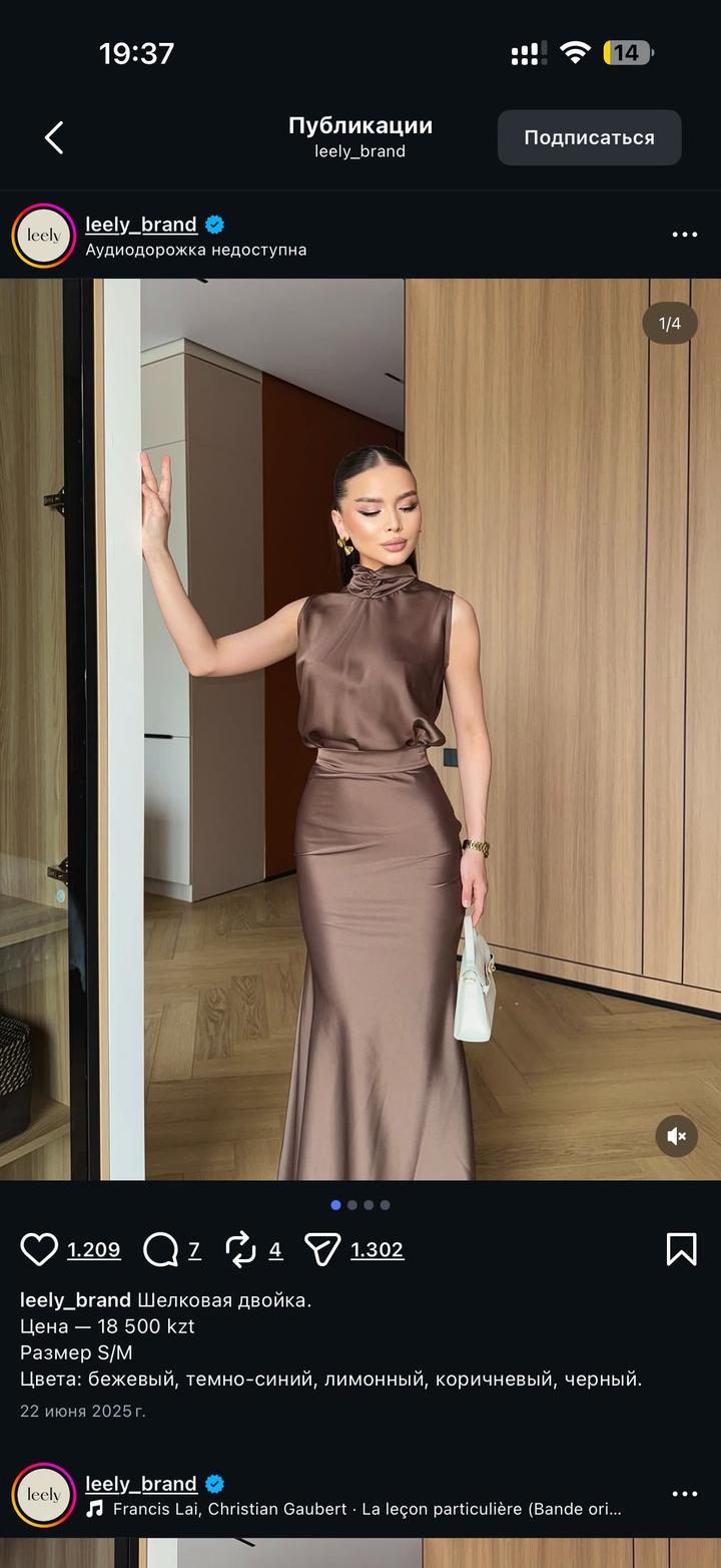 Коричневая двойка из шелка. Покупала за 18.500. Надевалось 1 раз. Размер S. г. Алматы Артикул: 547363