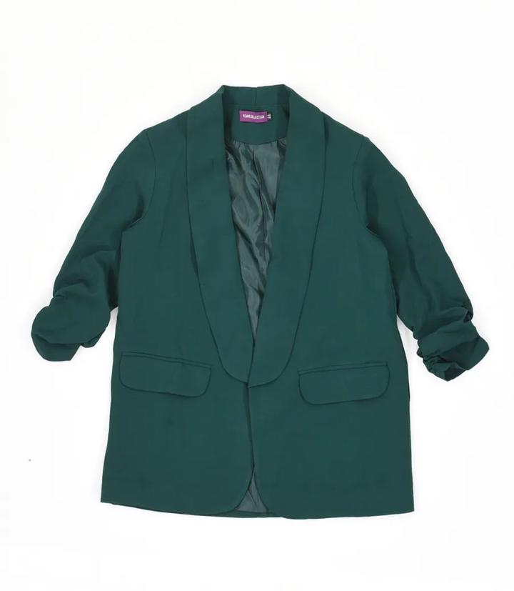 Стильный жакет глубокого изумрудного (темно-зеленого) цвета. Главная фишка модели — рукава 3/4 с фабричной сборкой, которые всегда выглядят аккуратно и придают образу расслабленный, современный вид. Артикул: 547708
