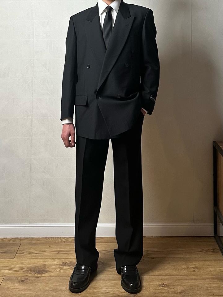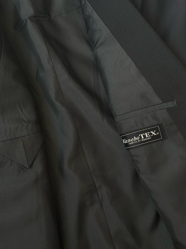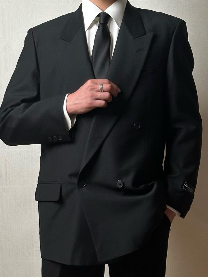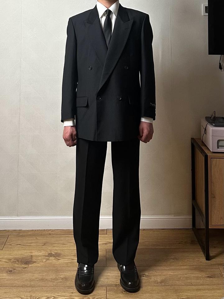 Kanebo TEX | L (175см) Классический двубортный костюм 4х1 в элегантном черном оттенке. Прямой крой, широкие лацканы и миланская петля. Брюки с высокой талией и с боковыми регуляторами. 100% шерсть Плечи 46 Грудь 54 Рукава 62 Длина 77 Талия 72-84 Бедра 106 Посадка 30 Выход 23 Длина 115 Made in Japan 🇯🇵 Состояние новое, с бирками 10/10 Параметры модели: рост 175, размер С-М Артикул: 547715