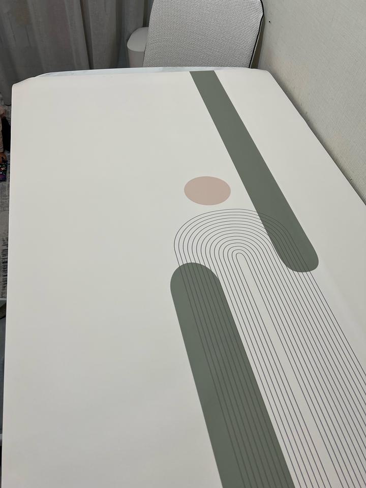 Скатерть с современным минималистичным принтом. Светлая база, стильные геометрические элементы. Подойдет для кухни или столовой. Состояние новое. Заказывала для себя , но ошиблись размером. Материал плотный , практичный . Артикул: 547816