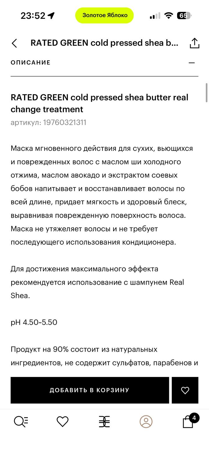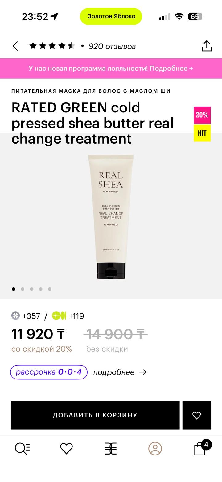 RATED GREEN cold pressed shea butter real change treatment Маска мгновенного действия для сухих, вьющихся и поврежденных волос с маслом ши холодного отжима, маслом авокадо и экстрактом соевых бобов напитывает и восстанавливает волосы по всей длине, придает мягкость и здоровый блеск, выравнивая поврежденную поверхность волоса. Покупала в Зя. Не подошел другую купила Артикул: 548065