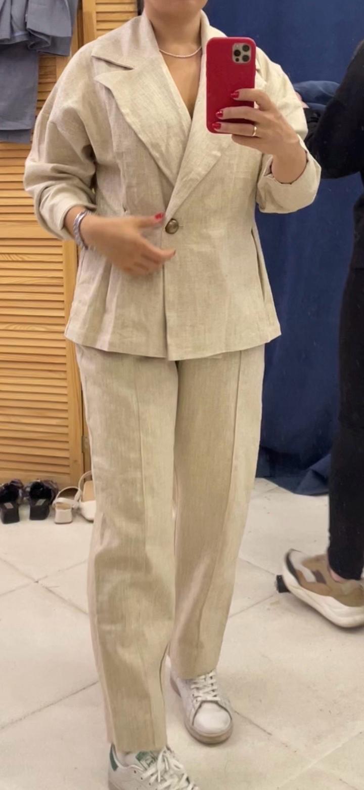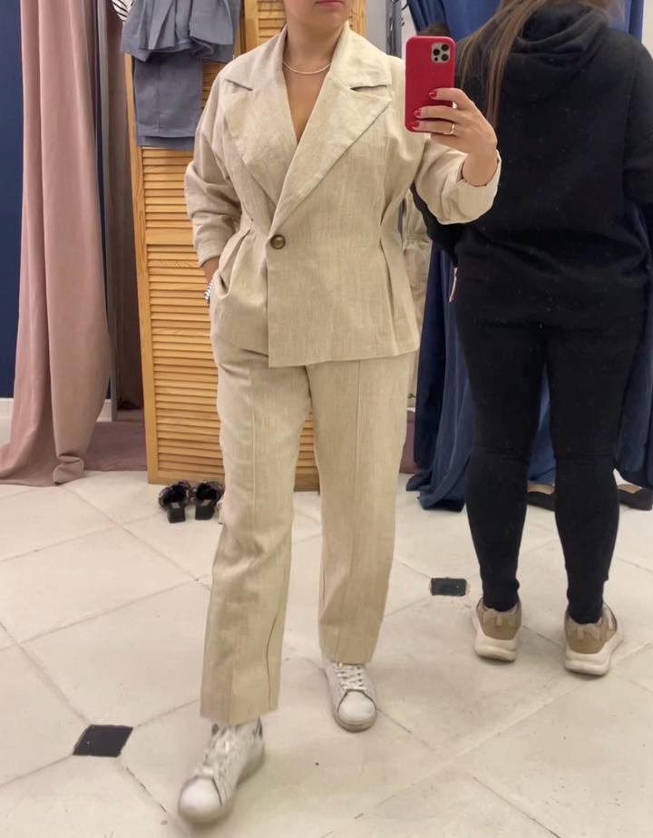 Продается брючный костюм из мешковины (хлопковая ткань с джутовыми волокнами).Брюки на резинке, на вискозном подкладе.Костюм подходит для прохладной весны.Очень стильный, цвет комбинируется практически со всеми оттенками. В носке пару раз (Бренд REDCROW).Подходит на полный 46 размер. Артикул: 548355