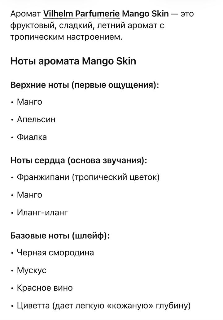Парфюм от VILHELM PARFUMERIE Аромат mango skin Практически новый, использовала 4 пшыка. Очень приятный аромат, продаю, так как не пользуюсь им. Покупала в Золотом Яблоке Без коробки. Сочный спелый манго, немного сливочный и тропический, с теплым мускусным шлейфом. Многие ощущают его как «запах спелого манго с кожурой и легкой сладостью». Артикул: 548581