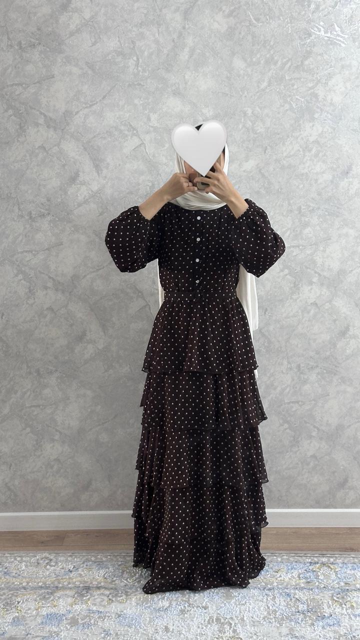 Коричневое длинное платье в горошек из шифона, передние пуговицы рабочие. Имеется ремешок в комплекте, в отличном состоянии, надевался лишь 1 раз Артикул: 548590