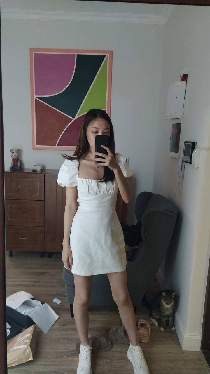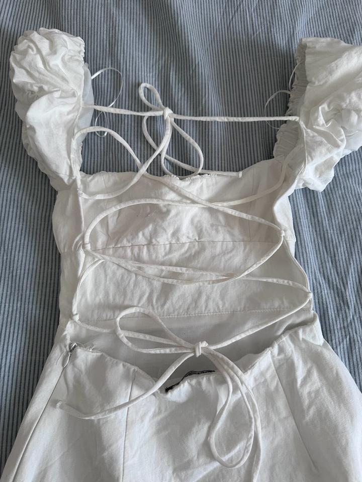 Белое мини платье. Спина открыта и на шнуровке. Размер xs, материал: хлопок, лен, полиэстер. Продаю так как уже не влезаю в него. Носила пару раз. Артикул: 548650