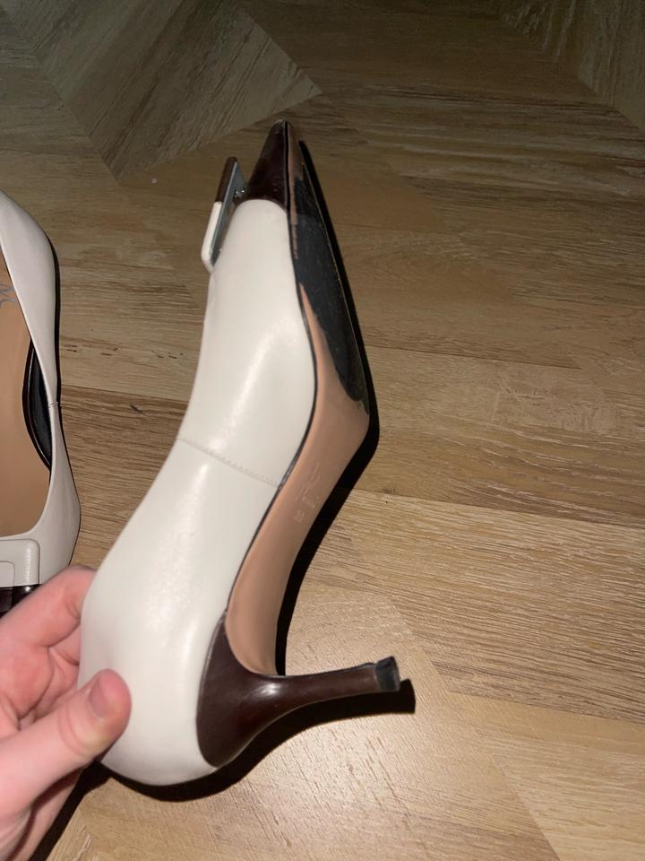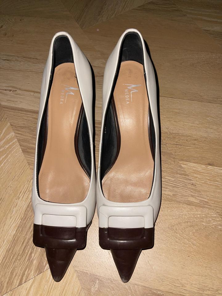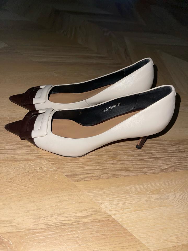 Стильные женские туфли в классическом дизайне. Модель в двухцветном оформлении: светлый верх с тёмным носком, аккуратный каблук, элегантный и современный вид. Туфли удобные, хорошо подойдут для офиса, учёбы, праздника или повседневного образа. Смотрятся красиво и аккуратно. Артикул: 548825