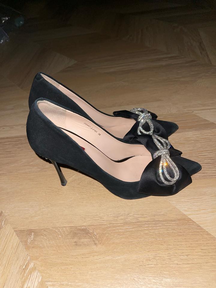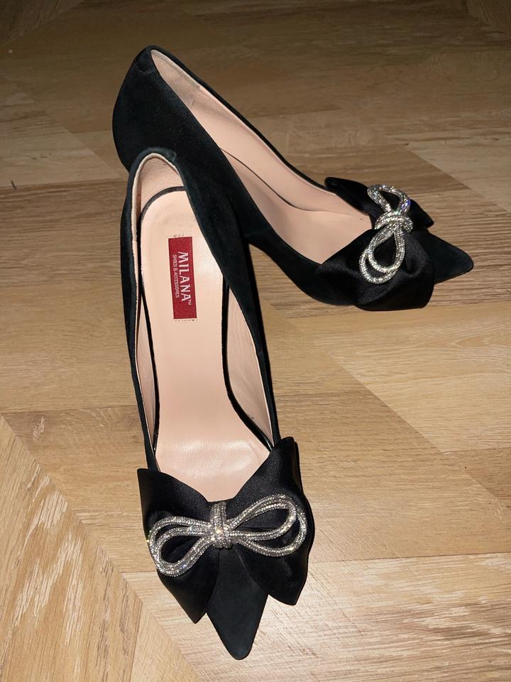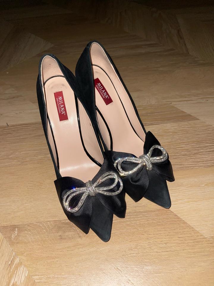 Элегантные чёрные туфли Milana. Стильная модель с острым носком и аккуратным каблуком. Декоративный бант со стразами делает туфли нарядными и эффектными. Подойдут для праздника, офиса, вечернего выхода или особого случая. Смотрятся красиво, женственно и дорого. Артикул: 548835