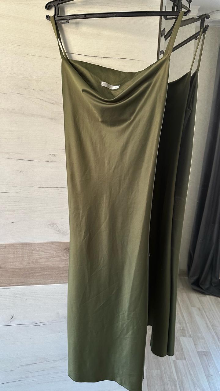Зеленое атласное платье средней длины на лямках . Размер М Артикул: 548914