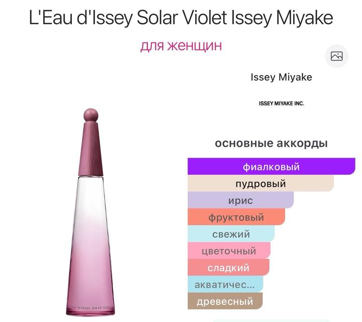 L'Eau d'Issey Solar Violet Issey Miyake — Eau de toilette Intense Верхняя нота: Груша; средняя нота: Фиалка; базовая нота: Ирис. Оригинал, есть чек о приобретении Аромат не подошел, без 1 распыления Изначально налит не под горлышко Артикул: 549296
